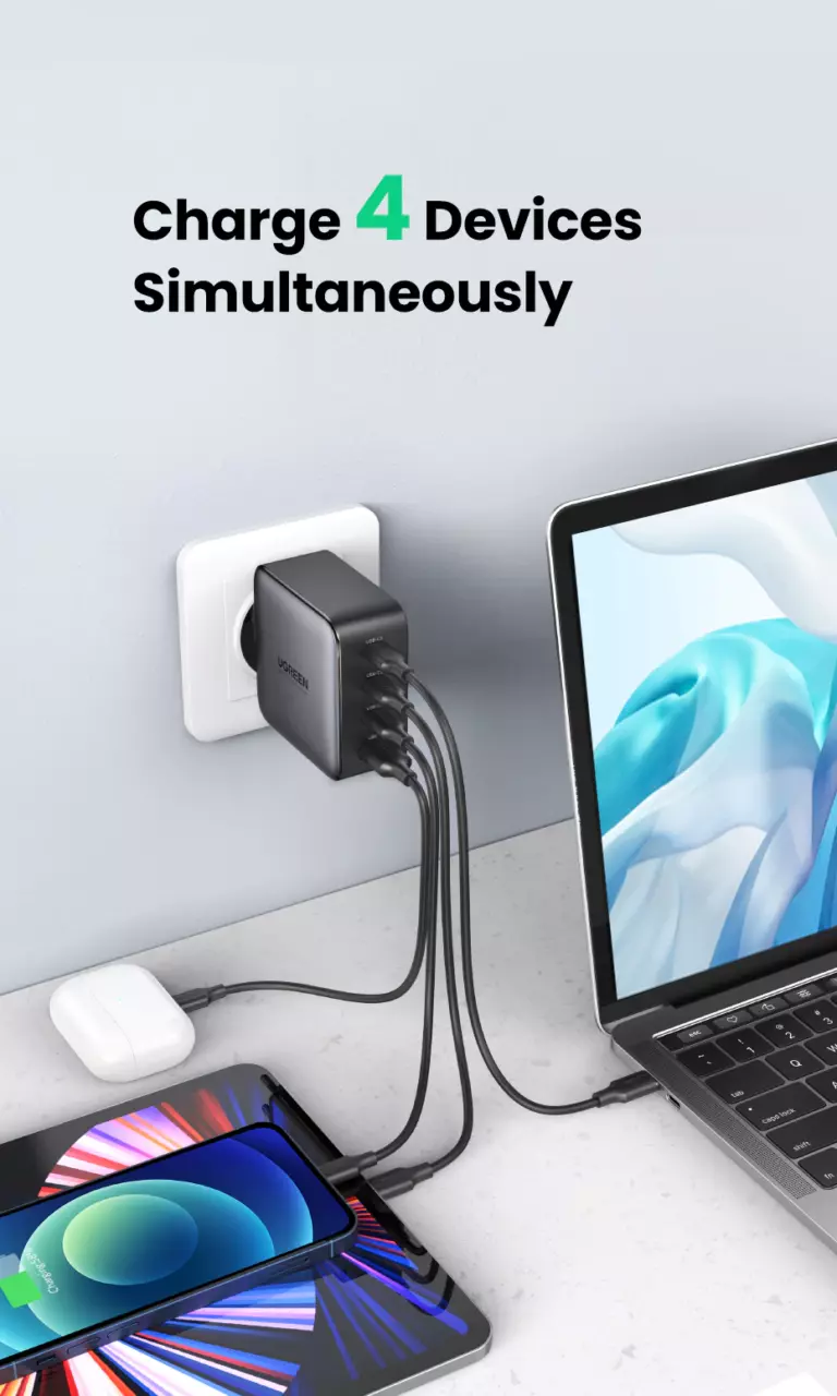 Зарядний пристрій UGREEN GaN PD дозволяє зарядити iPhone 12 на 60% за 30 хвилин і підтримує швидке заряджання 4 пристроїв одночасно.
