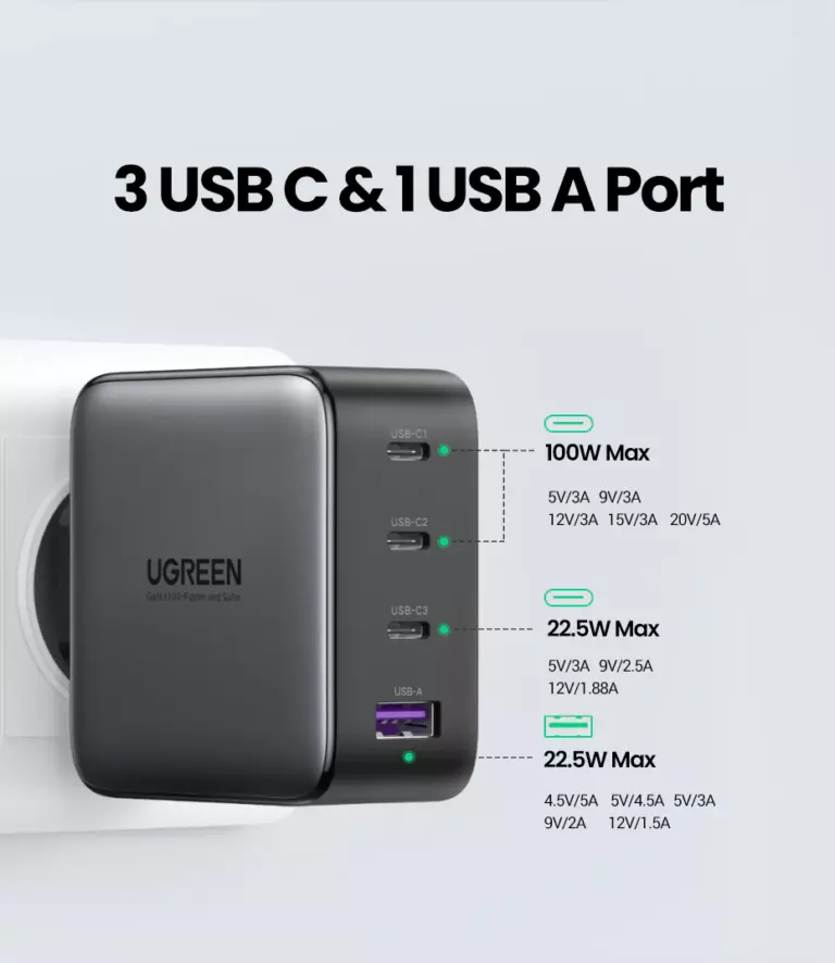 Швидкий мережевий зарядний пристрій UGREEN GaN Fast Charger 100W 3 Type-C + USB Type A PD 3.0 QC4.0 40747 Black