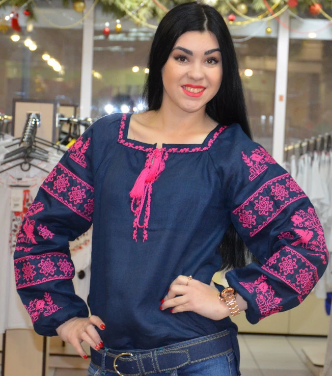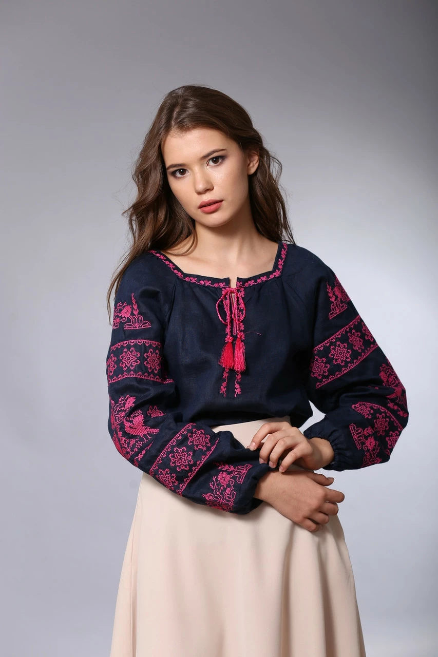 Синяя женская вышиванка "Птица", розовая вышивка