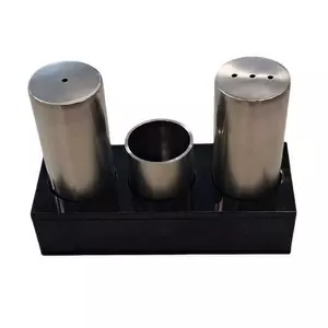 Цей сучасний набір 3-в-1 ідеальне рішення для сервірування столу. В нього входять дві ємності з нержавіючої сталі для солі та перцю, а також центральний стаканчик для зубочисток або серветок. Все це розміщено на підставці, яка забезпечує порядок та зручність.