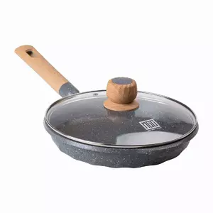 Зручна бакелітова ручка, стійка до нагрівання, робить користування безпечним, оскільки вона не нагрівається під час приготування. Кришка з жароміцного скла дозволяє легко контролювати процес приготування їжі, не втрачаючи тепло та аромат. Завдяки товстому дну в 5,5 мм, сковорода рівномірно розподіляє тепло і зберігає його, що забезпечує високу ефективність приготування.