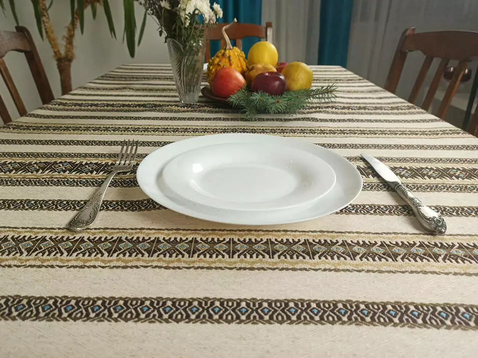 Скатертина на кухню лляна з орнаментом коричнева Коричневий, 215х145 см, Без серветок