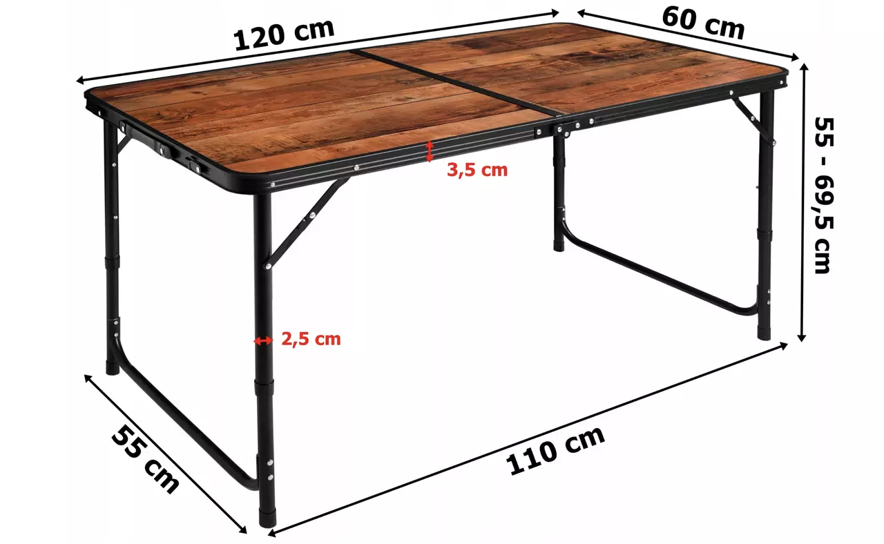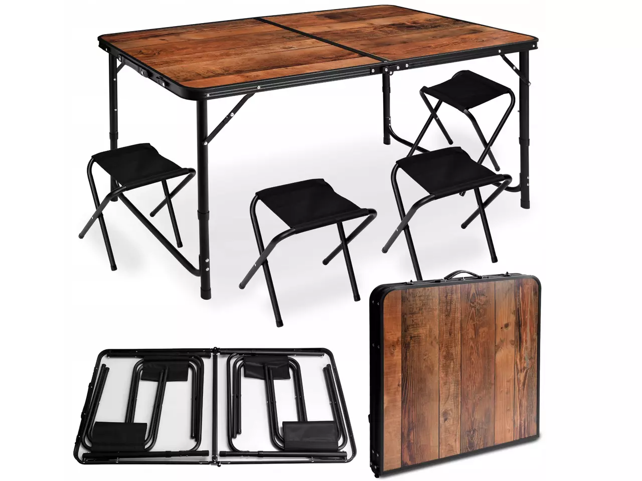 Trip table - практичний туристичний стіл, виготовлений з високоякісних матеріалів. Продумане поєднання алюмінієвої конструкції каркаса зі стільницею з МДФ забезпечує надійність і стійкість столу. Безперечною перевагою моделі є невелика вага. Все завдяки використаному в процесі виробництва алюмінію. Мала вага гарантує безпроблемне транспортування. Стіл легко розкладається, а після складання приймає зручну форму валізи. Вбудована ручка полегшує перенесення. Стіл має трирівневе регулювання висоти, завдяки чому ми можемо підлаштувати його під свої потреби. У виконанні Black Wood стіл Trip оснащений стільницею з цікавим малюнком, що імітує дерево. 4 зручні крісла в комплекті!