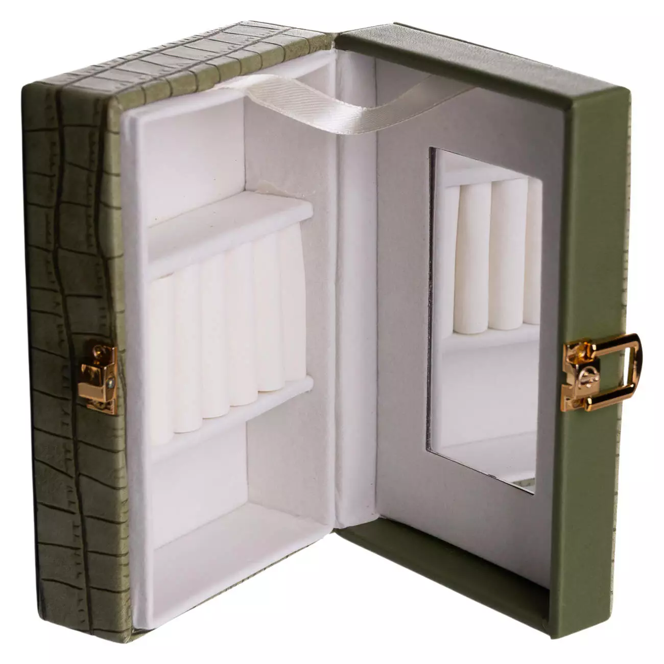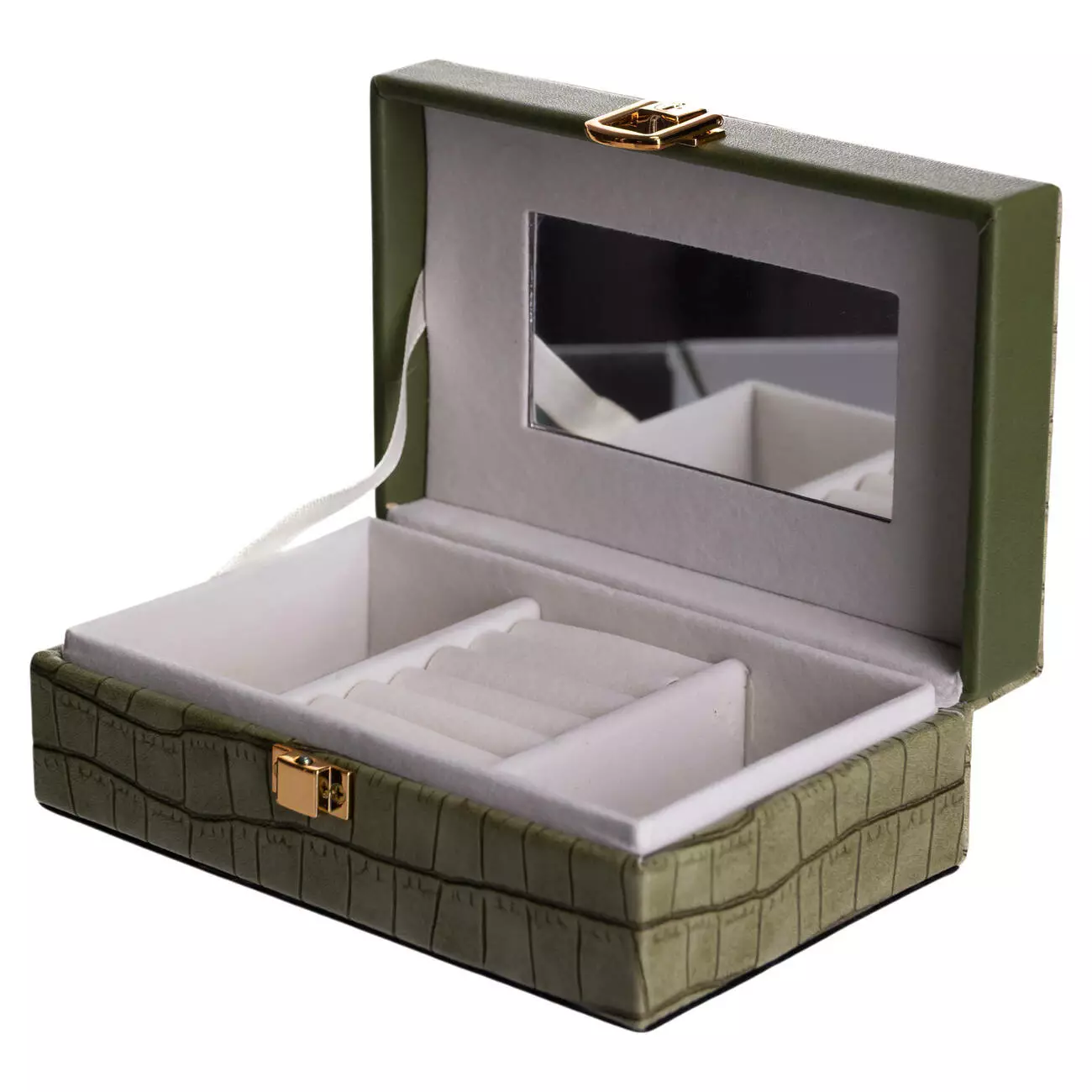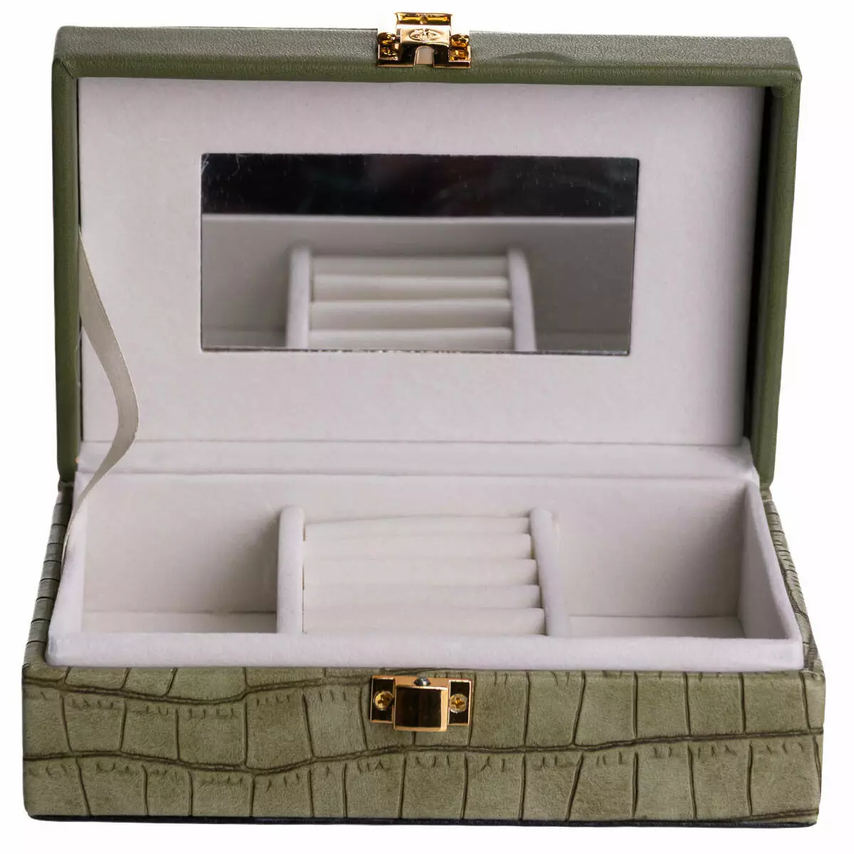 Внутрішній простір поділений на три комірки для зручного сортування прикрас, годинників або інших дрібних аксесуарів. На внутрішній стороні кришки розміщене дзеркало, що додає практичності під час використання. Внутрішнє покриття з велюру сприяє дбайливому зберіганню виробів і зменшує ризик подряпин.
