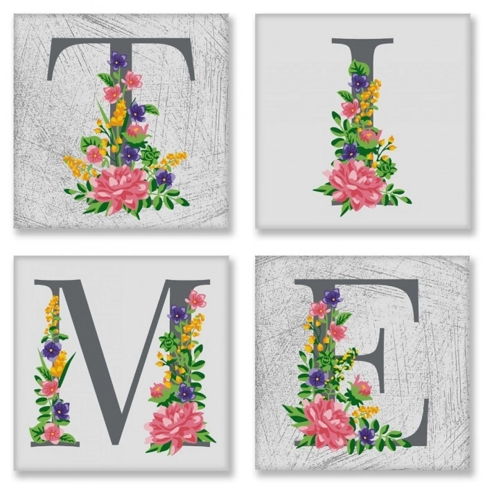 Додайте затишок в свою оселю! Малюйте чудові квіткові слова за номерами і додавайте сенсу вашого інтер'єру. Кожна буква розташована на окремому полотні з кольоровим фоном - ви зможете скласти ексклюзивну композицію на свій смак. Вибирайте ніжні мотиви Провансу, Скандинавську лаконічність або лофтового контраст.   Склад набору: -4 полотна з кольоровим фоном на підрамниках 18 * 18. На кожному полотні розміщені контури букви в квітковому оформленні з номерами під розмальовку. - 2 пензлика (середня і маленька) - Набір акрилових пронумерованих фарб - Перелік пунктів - Інструкція   КОЖЕН НАБІР оформлений в подарункову обгортку З РУЧКОЮ !!!!