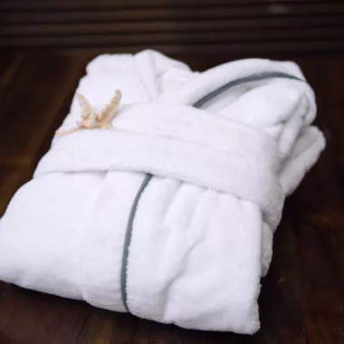 Белый халат с декоративным и элегантным серым обрамлением