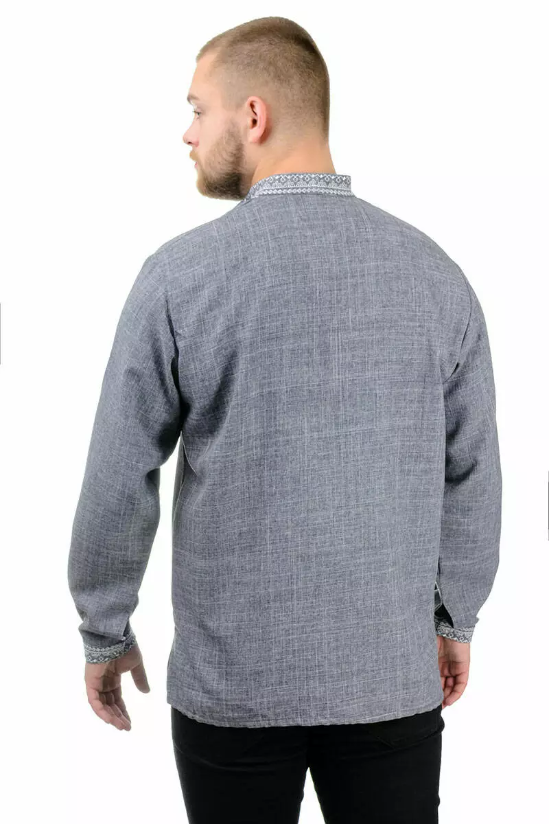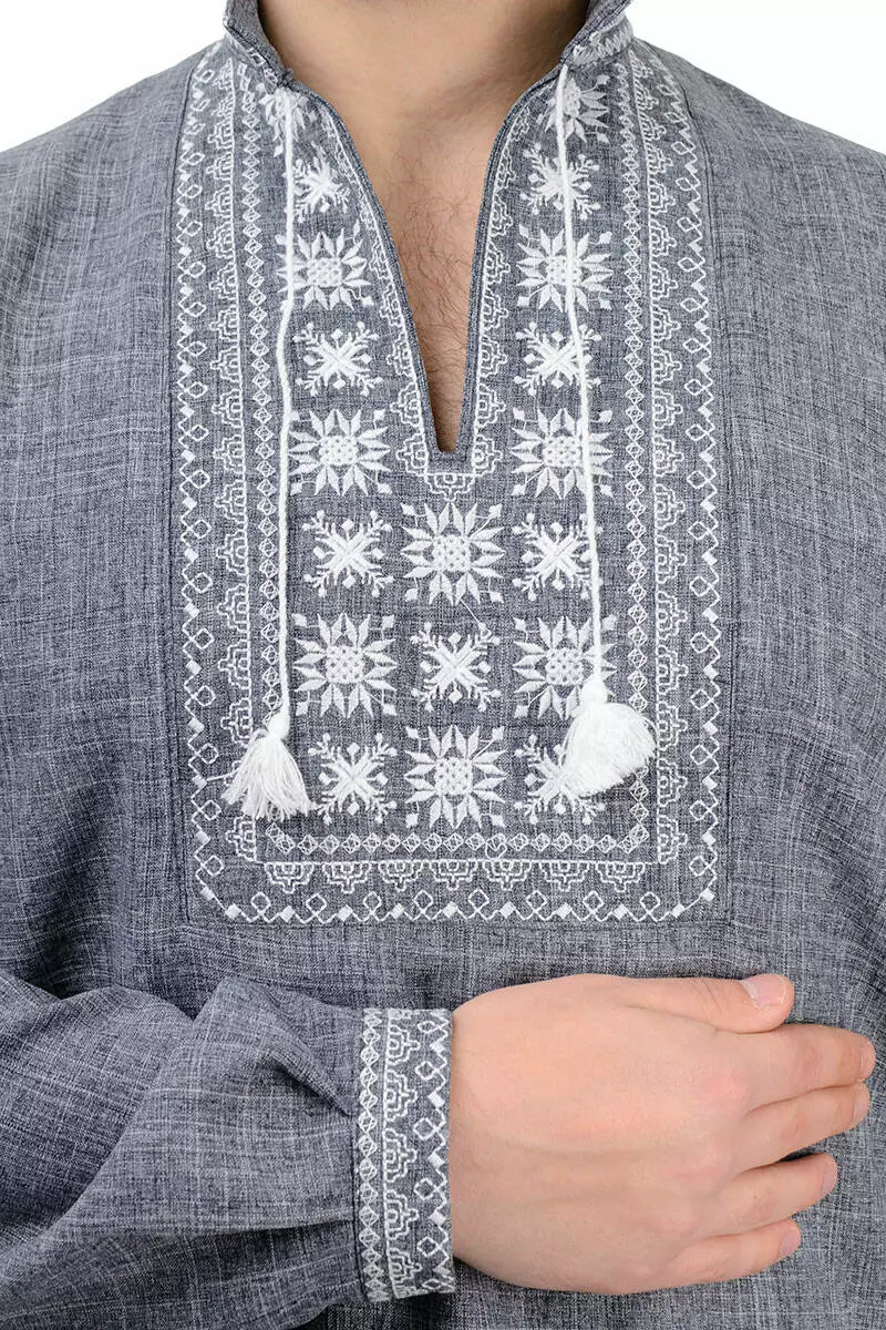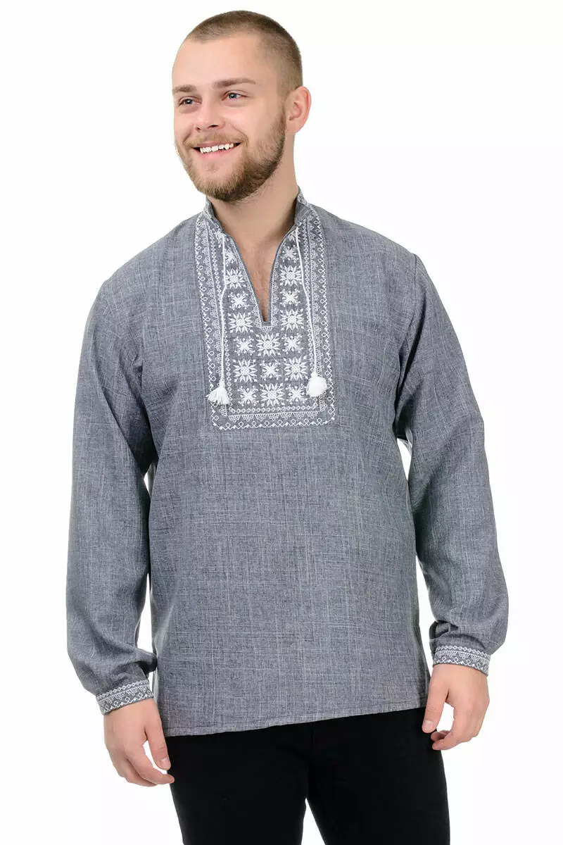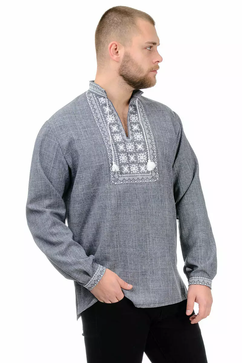 Головною окрасою й одночасно чарівною відмінністю сорочки є вишиті геометричні орнаменти. Білий візерунок довершує елегантний образ і робить виріб ще більш оригінальним. Крій сорочки вільний, рукава на манжетах і застібаються на ґудзик.