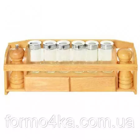 Деревянные солонка, перцемолка, 6 стеклянных емкостей для
