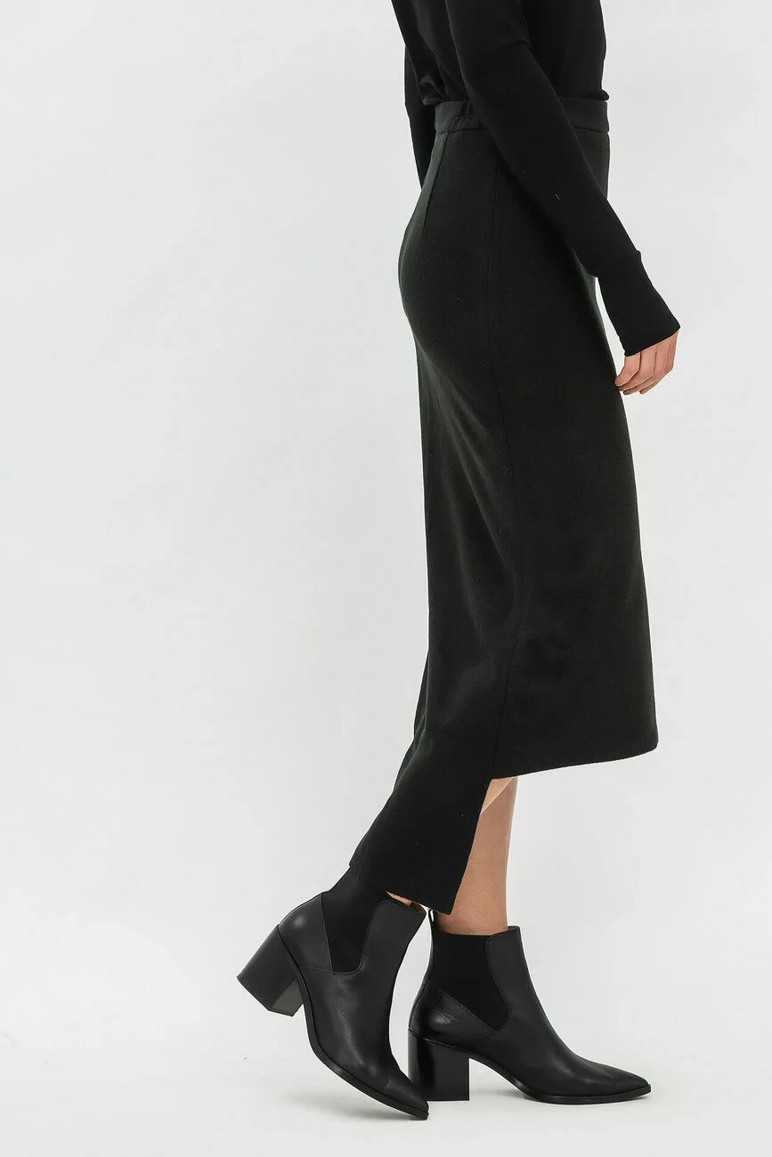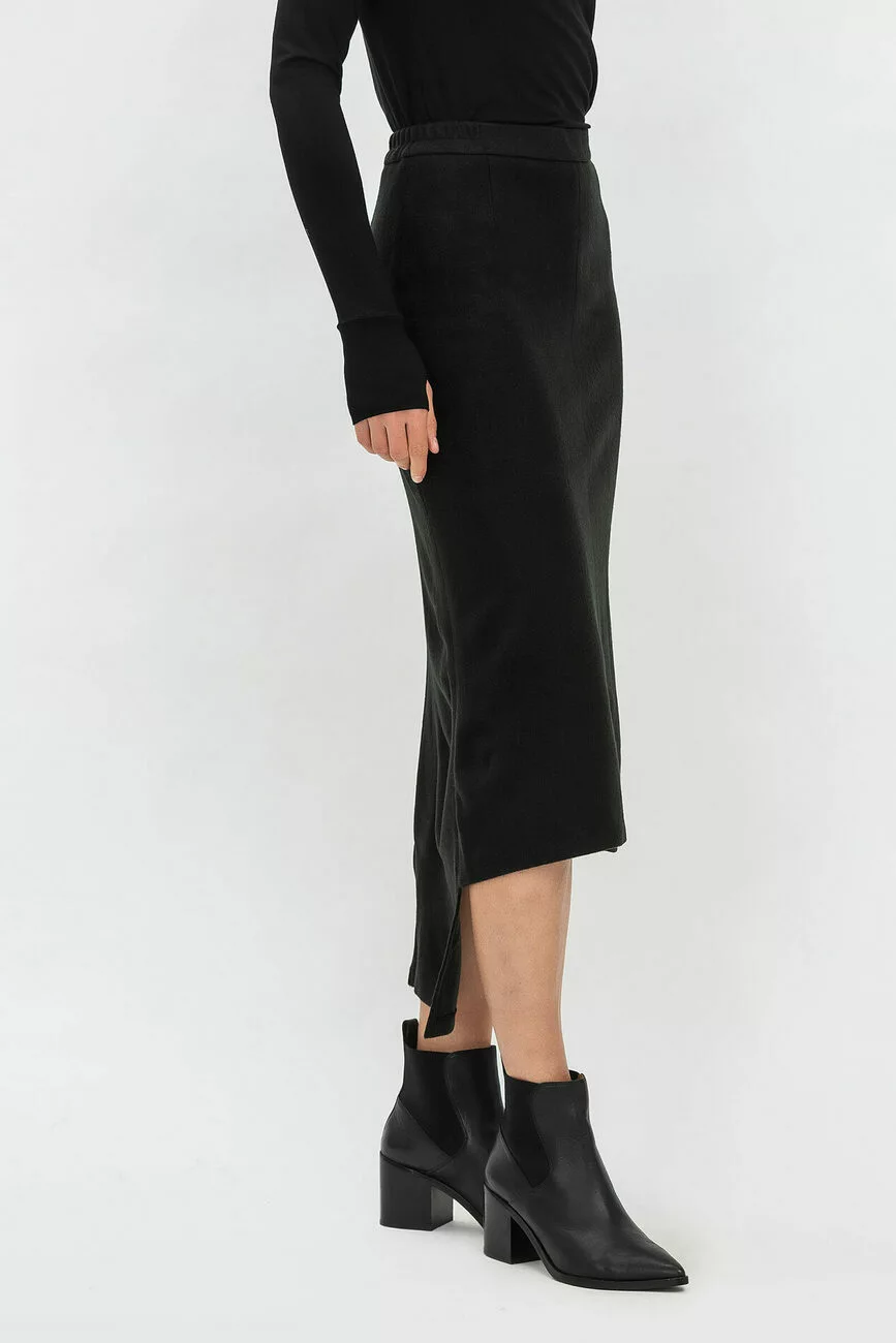 Небанальні речі з родзинкою – ось, що диктує мода в цьому році! Трикотажна модна спідниця міді з асиметричним низом стане оригінальною моделлю у вашому гардеробі! Силует виробу прямий, вигідно виглядає на панянках з будь-яким типом фігури. Цікаве дизайнерське рішення спідниці не лише приваблює увагу, але й чудово комбінується з різними жіночими блузками та взуттям.