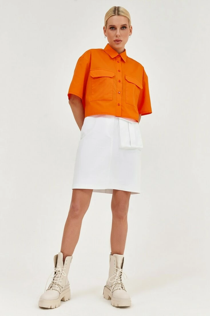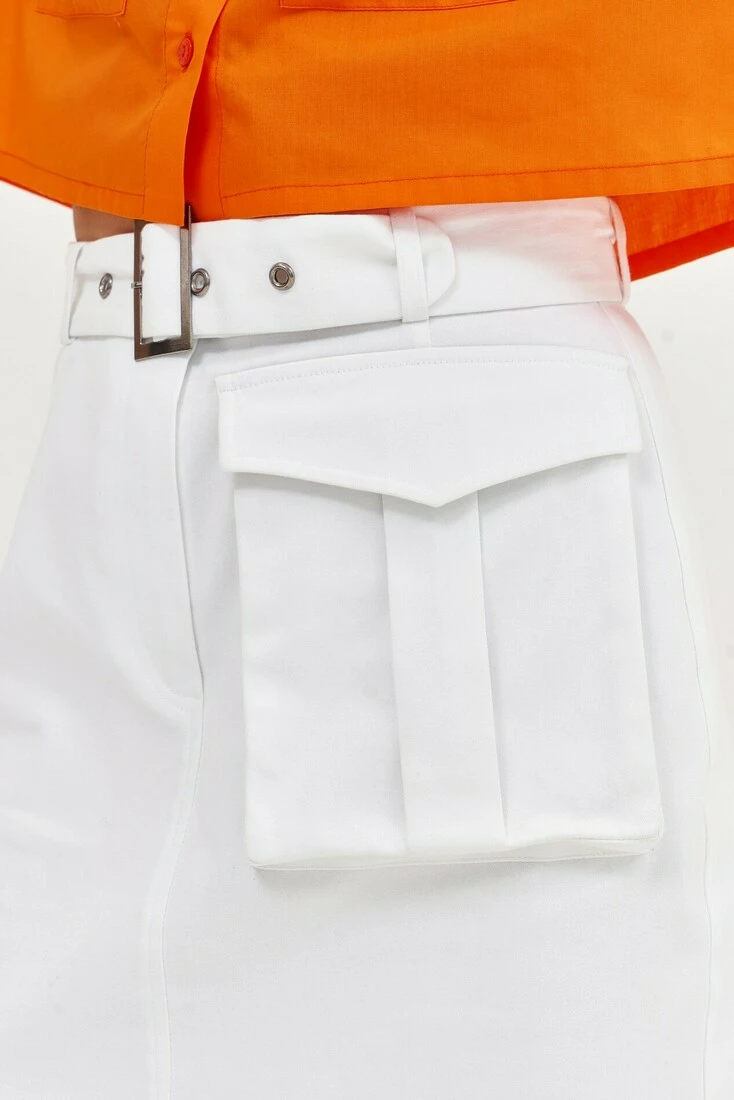 Якщо ставите перед собою мету створити водночас комфортний і стильний образ, то однозначно варто звернути увагу на цю спідницю. Її молочно-білий колір надає образу ніжності та свіжості, а накладні кишені роблять її не тільки модною, а й зручною у використанні. У них завжди можна зберігати необхідні дрібниці, що особливо актуально в повсякденному житті. Спідниця виготовлена з якісного котону, який приємний до тіла і забезпечує комфорт під час носіння. Її дизайн вирізняється лаконічністю та елегантністю. Спідниця облягає фігуру і підкреслює її красу, але при цьому не сковує рухів завдяки своїй еластичності. Це універсальний елемент гардероба, який дасть тобі змогу мати стильний і оригінальний вигляд у будь-якій ситуації.