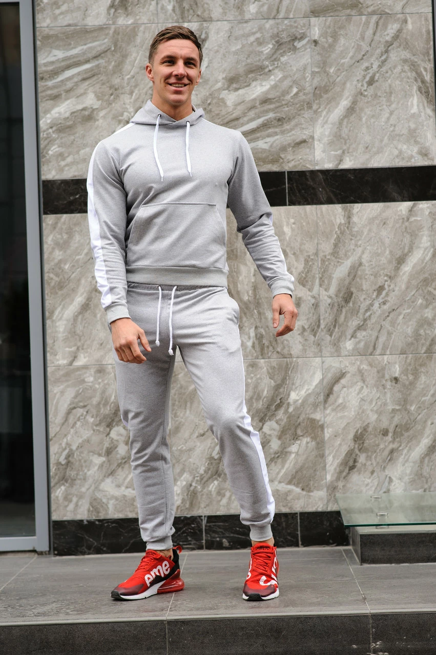 Спортивный костюм мужской весна-лето-осень (серая худи с лампасами +серые штаны с лампасами)