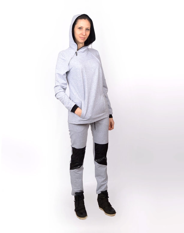 Модный женский спортивный костюм CK-0346 выполненный из высококачественного трикотажа, двунитки. Костюм дополнен оригинальными вставками из эко кожи на коленках штанин. Толстовка с капюшоном, карманами и застежкой молнией по бокам горловины, придаст вашему образу стиля. В нем вы будете чувствовать себя комфортно в любой ситуации.