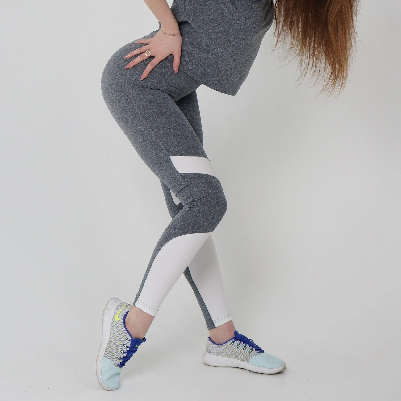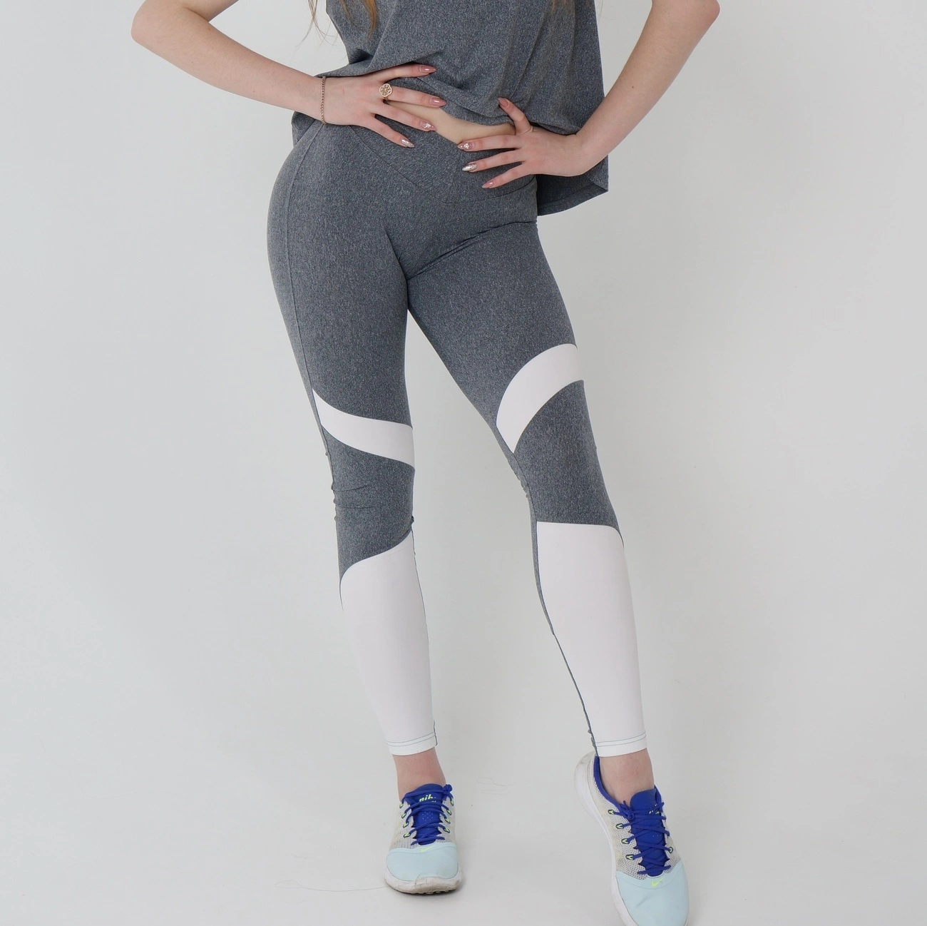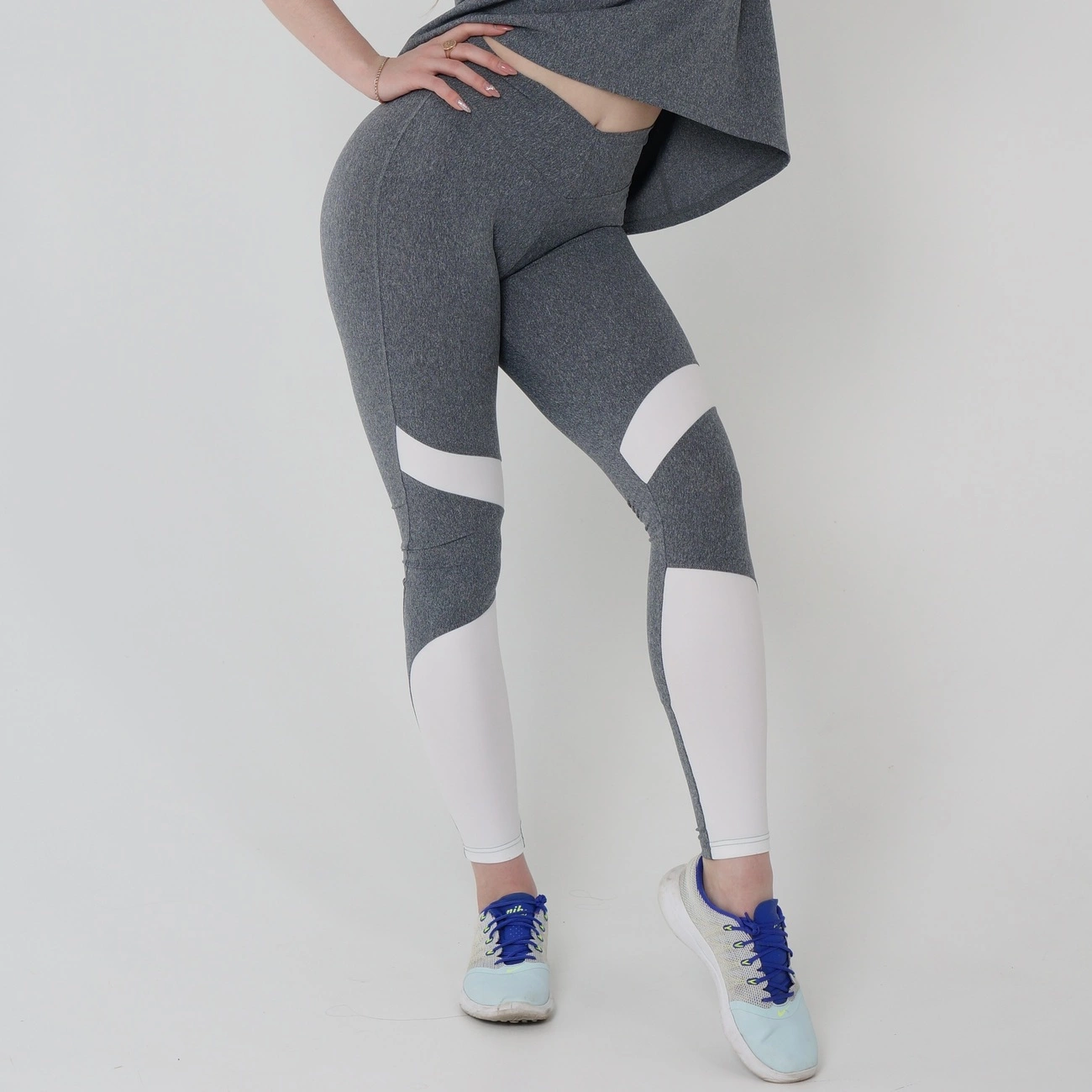 Серые спортивные леггинсы с белыми вставками над коленом и внизу.