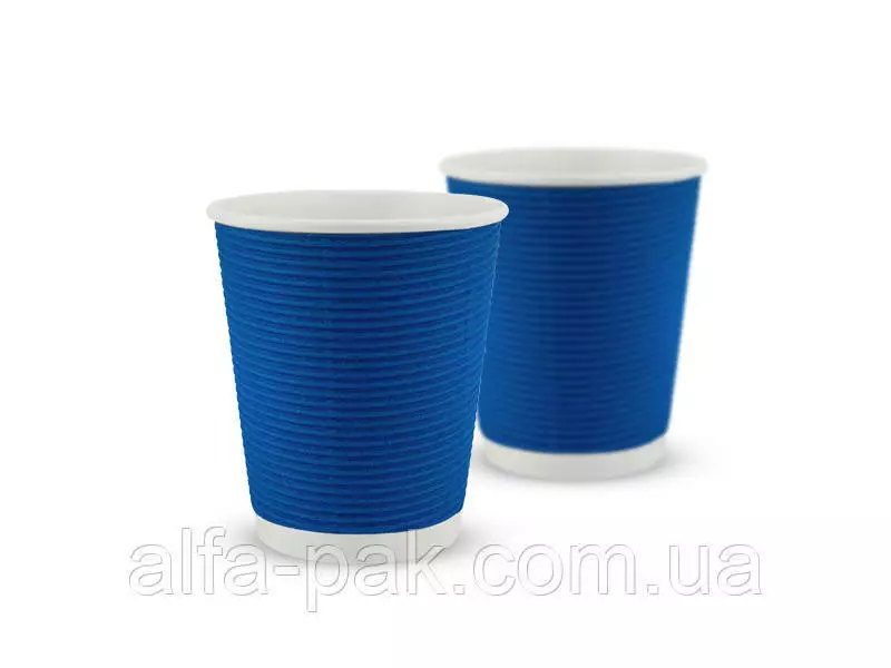 Стакан белый гофрированный синий 270 мл F-волна горизонтальная