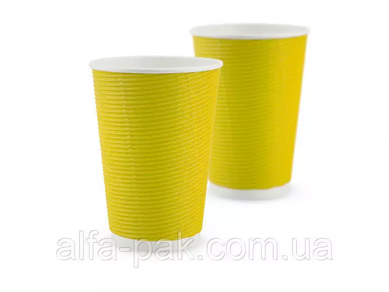 Стакан белый гофрированный желтый 340 мл F-волна горизонтальная