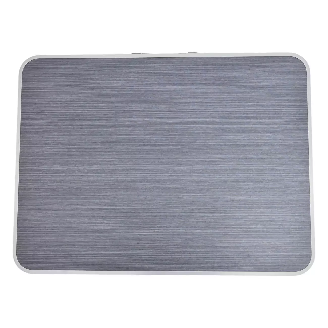 Каркас виготовлено з комбінації високоякісного алюмінієвого сплаву та залізної труби, що забезпечує хорошу стійкість і довговічність при експлуатації. Стільниця зроблена з плити МДФ — вона має рівну поверхню, стійку до навантажень і зручну для розміщення посуду, продуктів або іншого інвентарю. У розкладеному вигляді стіл має габарити 80*60*69,5 см, чого достатньо для комфортного використання.