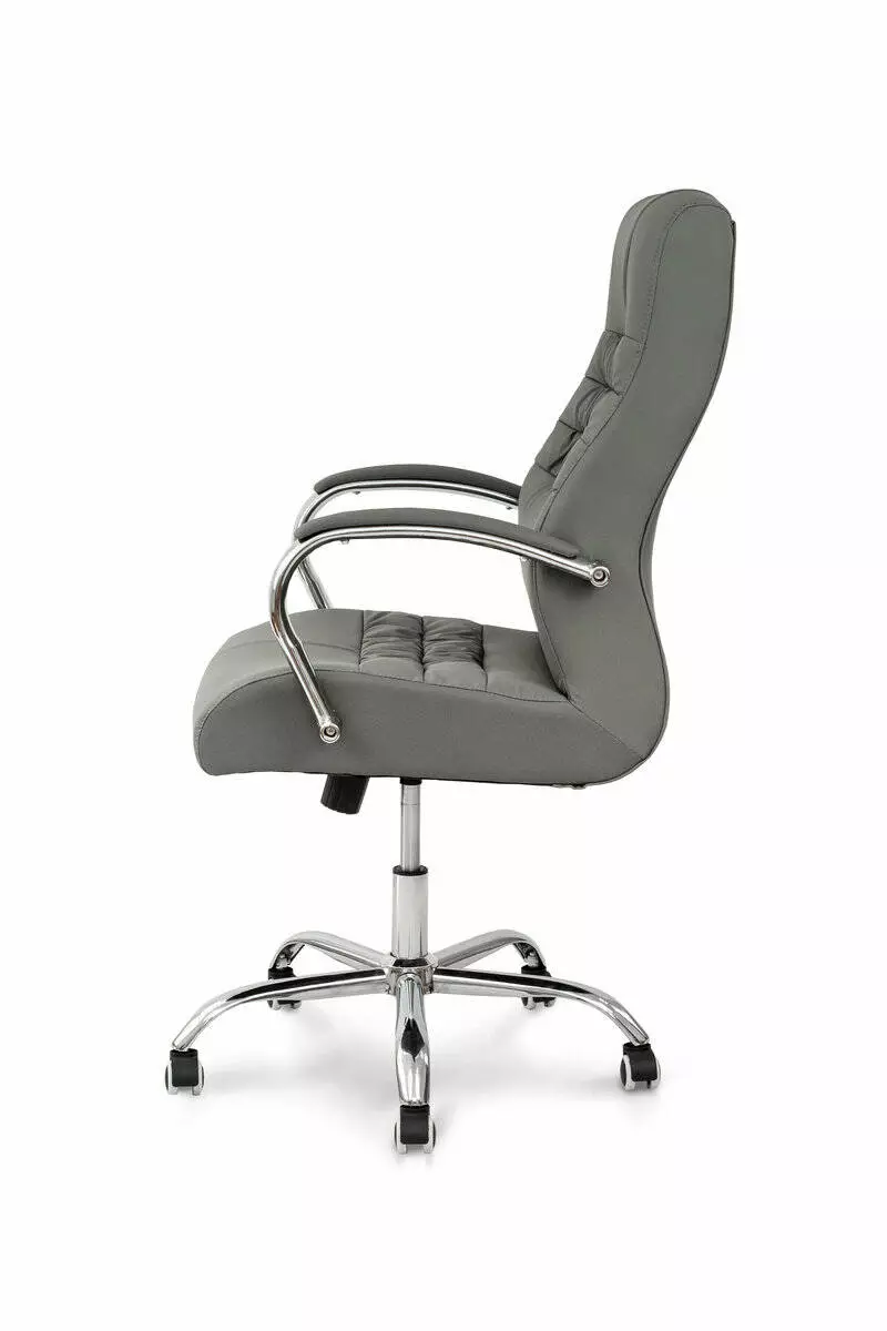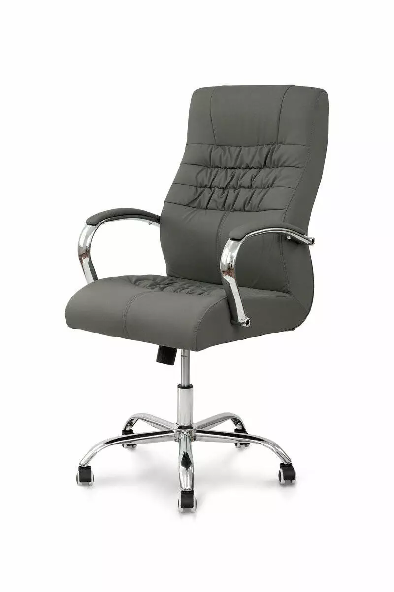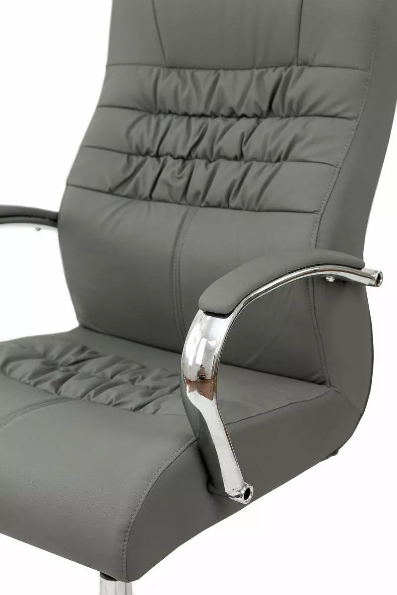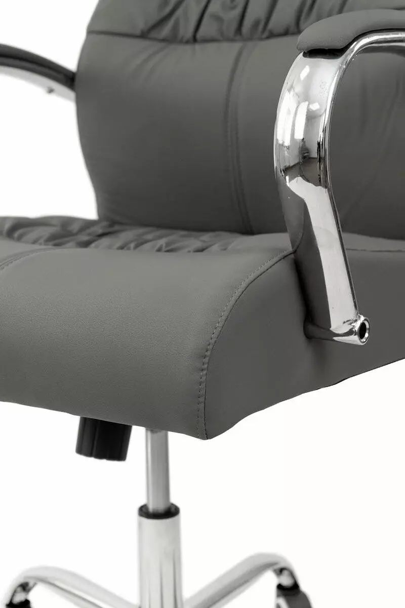 Розмір: Висота стільця (нижнє положення): 110 см; Сидіння: Ш - 51 см, Г: 48 см; Спинка: В - 66 см; Висота підлокітників: 20 см; Висота підйому механізму: 10 см; Ширина виробу: 60 см; Глибина виробу: 60 см; Колір: Каркас: Хром; Сидіння: Сірий, Оббивка: шкірзам Матеріал: Каркас: Метал; Сидіння: Фанера гнутоклеєна Ніжки - метал, хром Підйомний механізм - газліфт