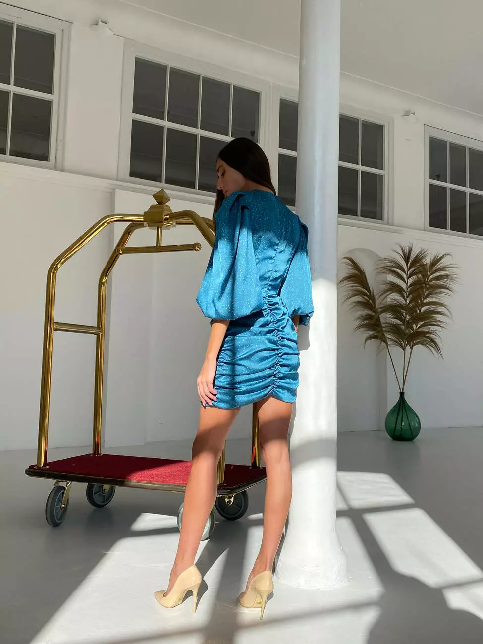 Стильна трендова шовкова міні сукня Kamilla з відкладним комірцем та V-подібним декольте бірюзового кольору в горох