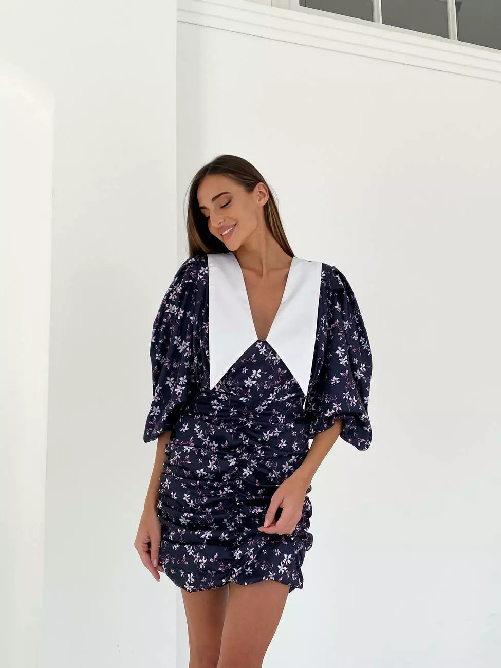 Стильна трендова шовкова міні сукня Kamilla з відкладним комірцем та V-подібним декольте чорного кольору квітковий принт