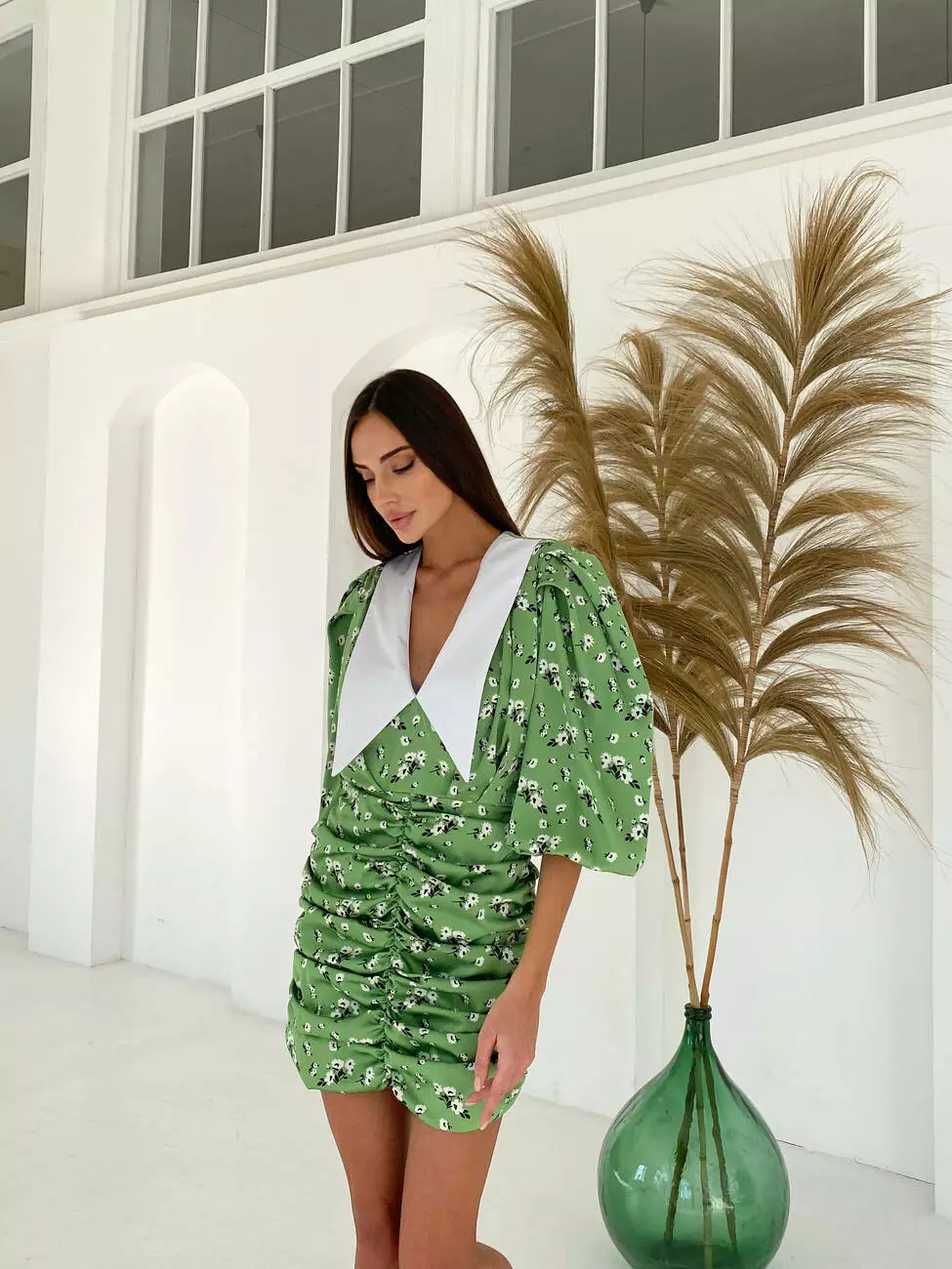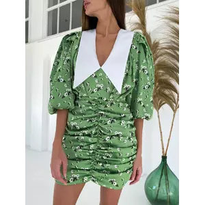 Стильна трендова шовкова міні сукня Kamilla з відкладним комірцем та V-подібним декольт зеленого кольору квітковий принт