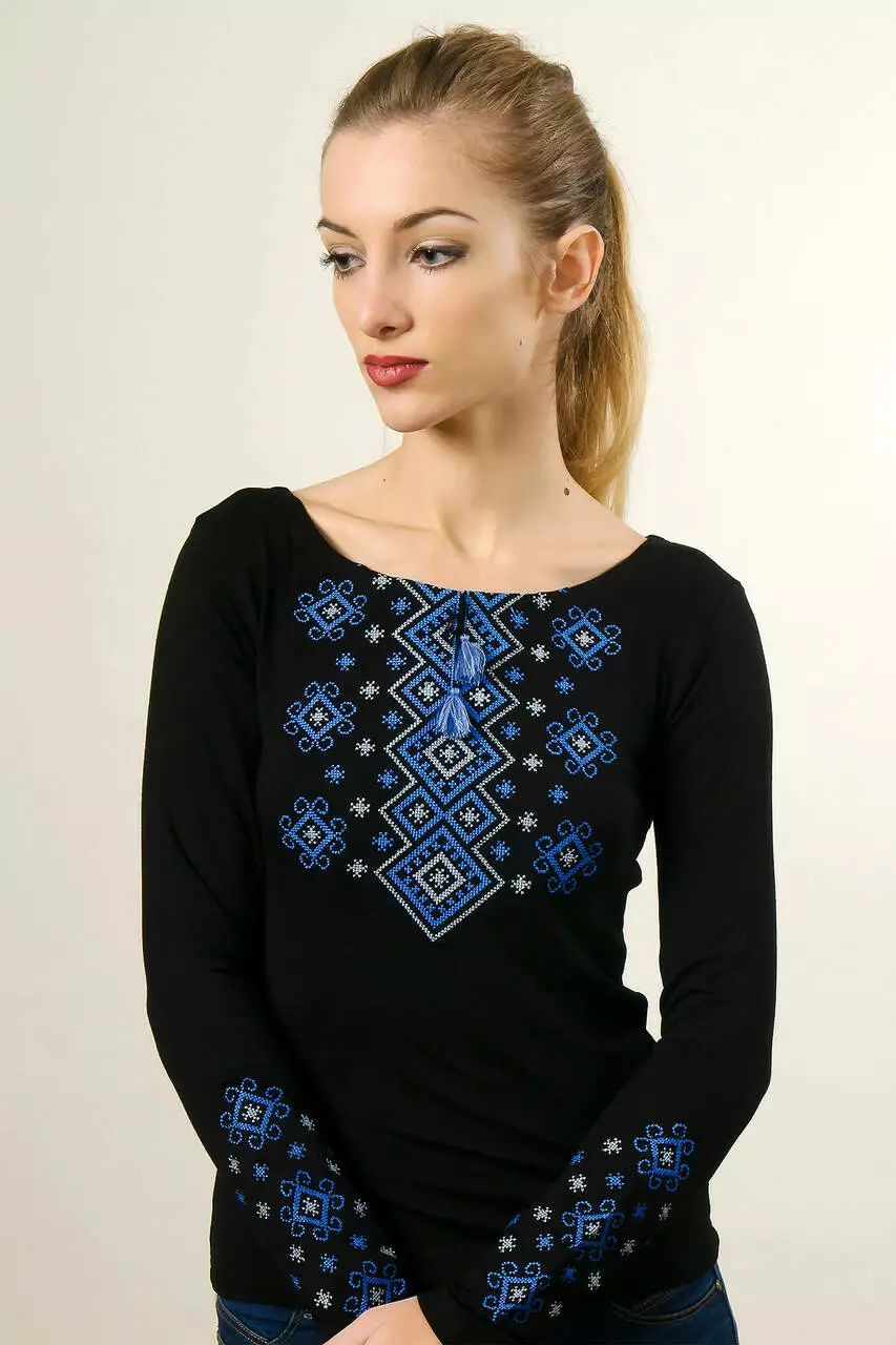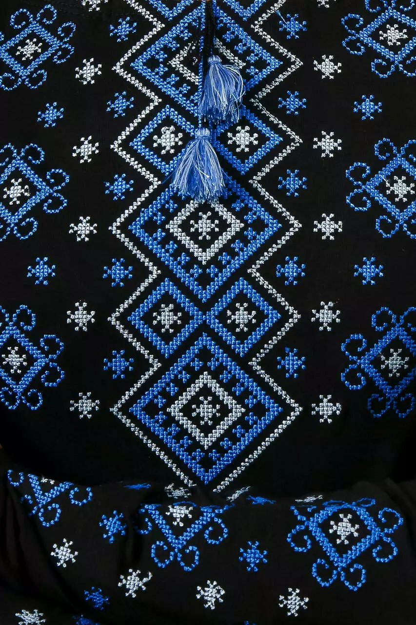 Особливу увагу привертає красивий орнамент. Для його створення дизайнери вибрали блакитні та білі нитки. Така геометрична композиція виглядає контрастно на чорній тканині. Візерунками прикрашено перед та рукави цієї моделі. Ніжні кутасики на горловині додають стриманості цій моделі.