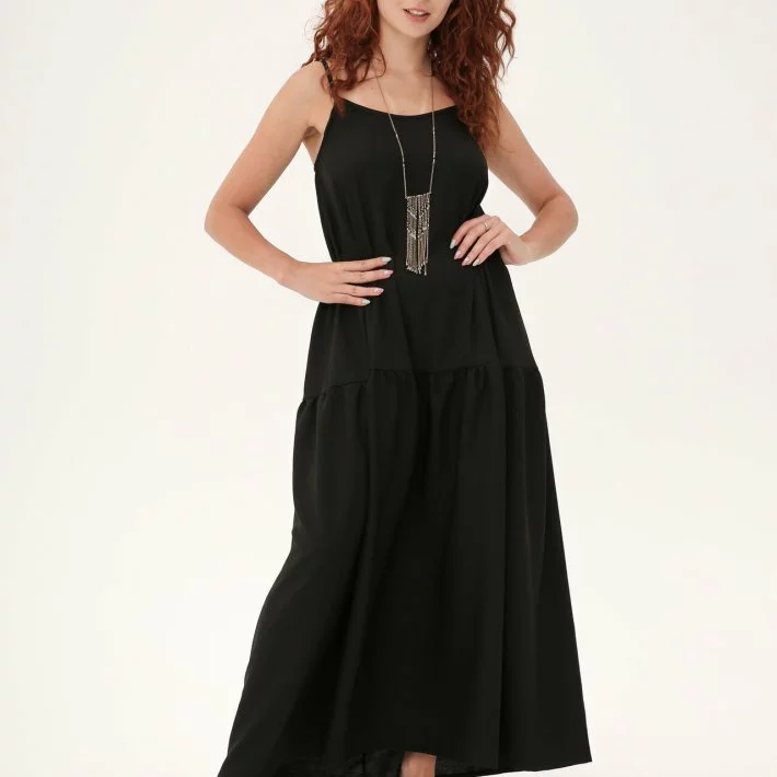 Довгий сарафан з бретелями виконаний з структурної тканини, позаду