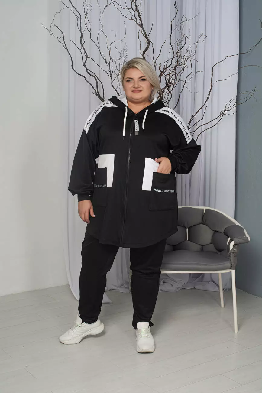 Стильний костюм з дайвінгу дуже гарної якості, гарна розтяжність, приємна до тіла, не линяє та не кашлатиться. Кофта вільного крою зі спущеним плечем застібається на змійку. Штани з високою посадкою, з кишенями, пояс на резинці. Костюм прикрашений якісними накатками.
