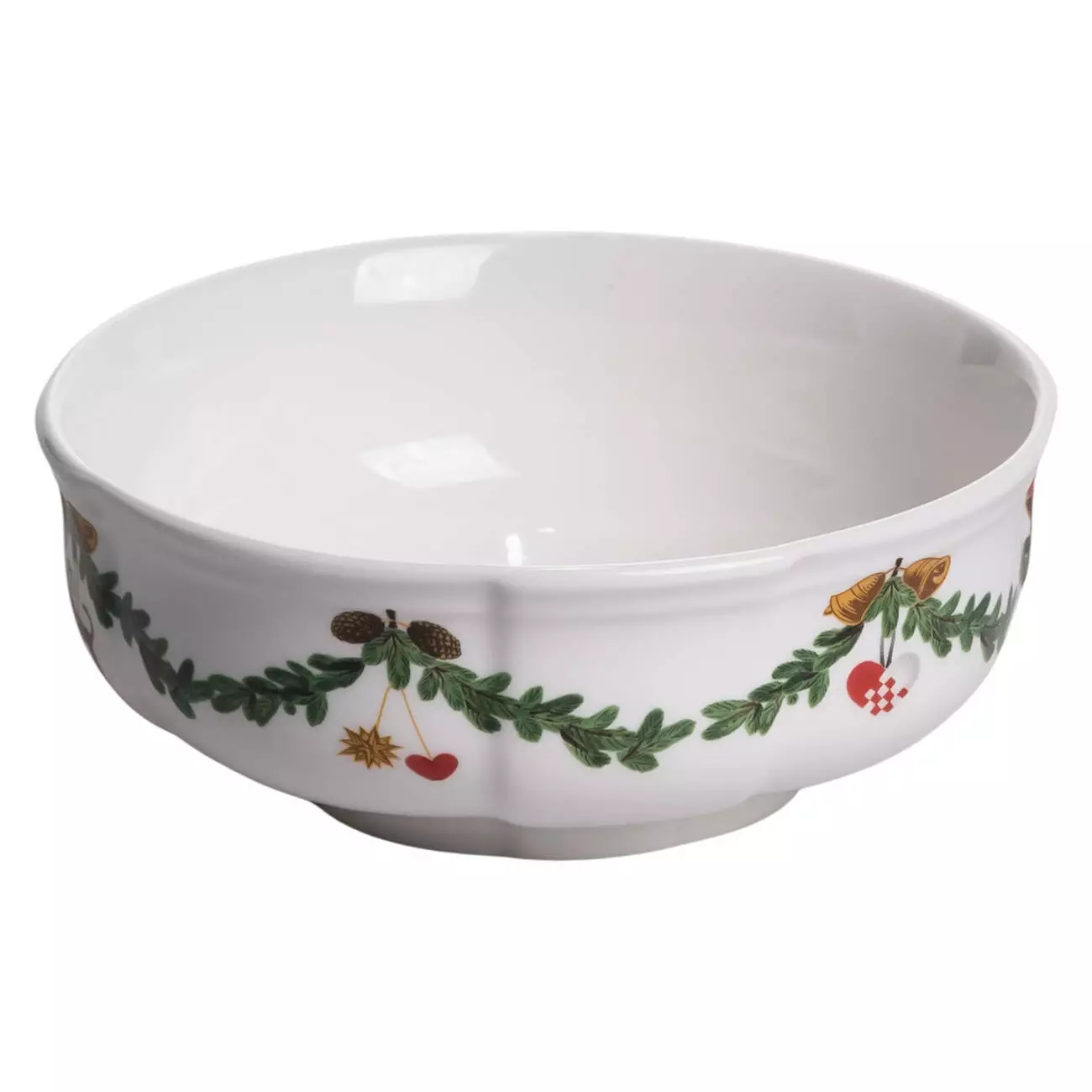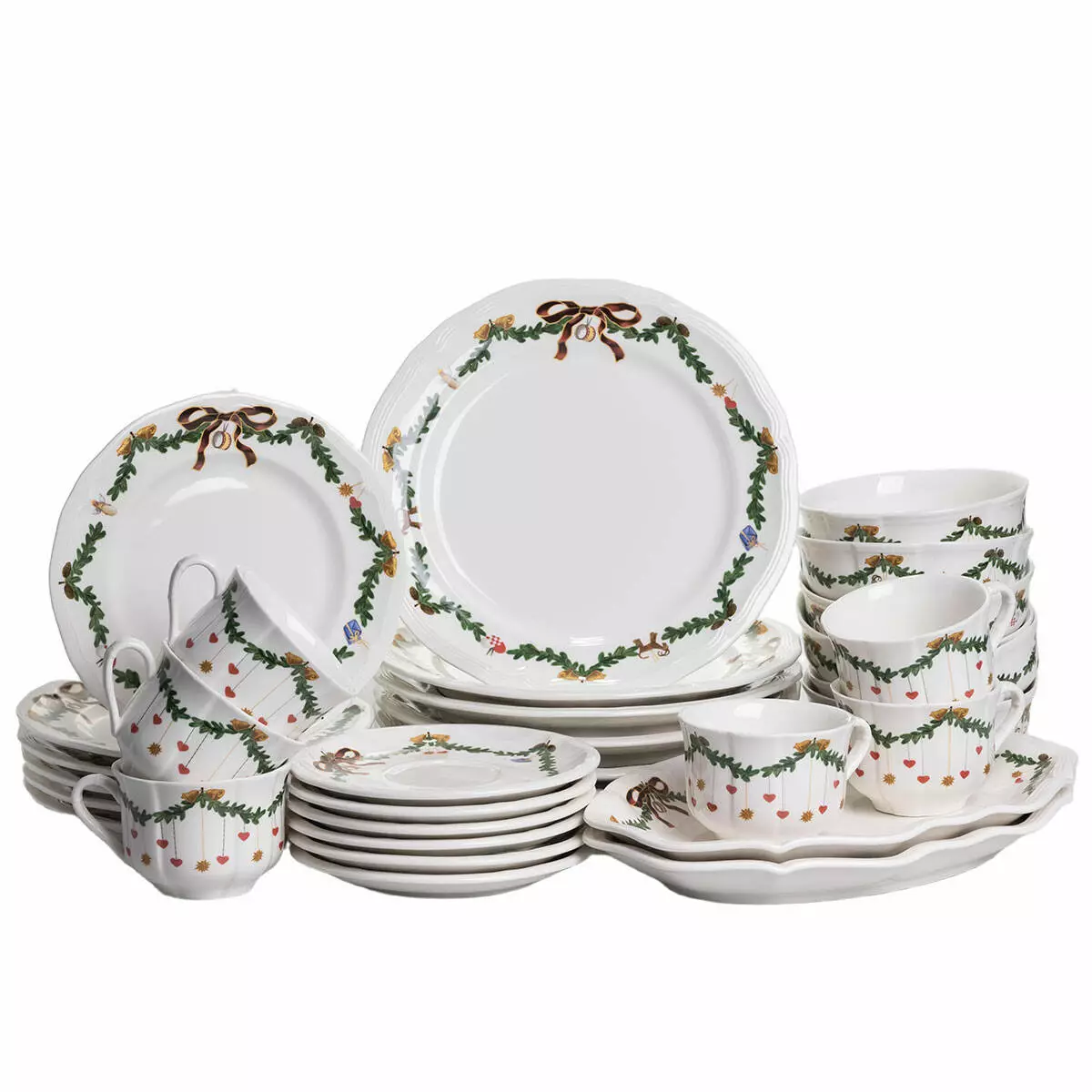 Новорічний порцеляновий столовий сервіз ROYAL на 32 предмети — це повноцінний набір посуду для сервірування святкового столу на 6 персон. Класична форма виробів поєднується з вишуканим новорічним декором — по краях кожного елемента проходить орнамент із гілочок, стрічок і святкових прикрас. Такий дизайн створює атмосферу тепла та затишку під час зимових свят і гармонійно доповнює святковий інтер’єр.