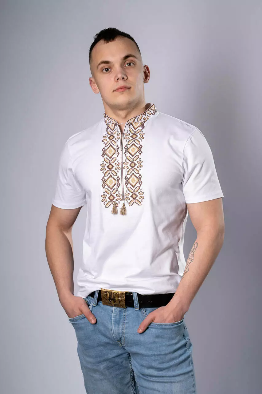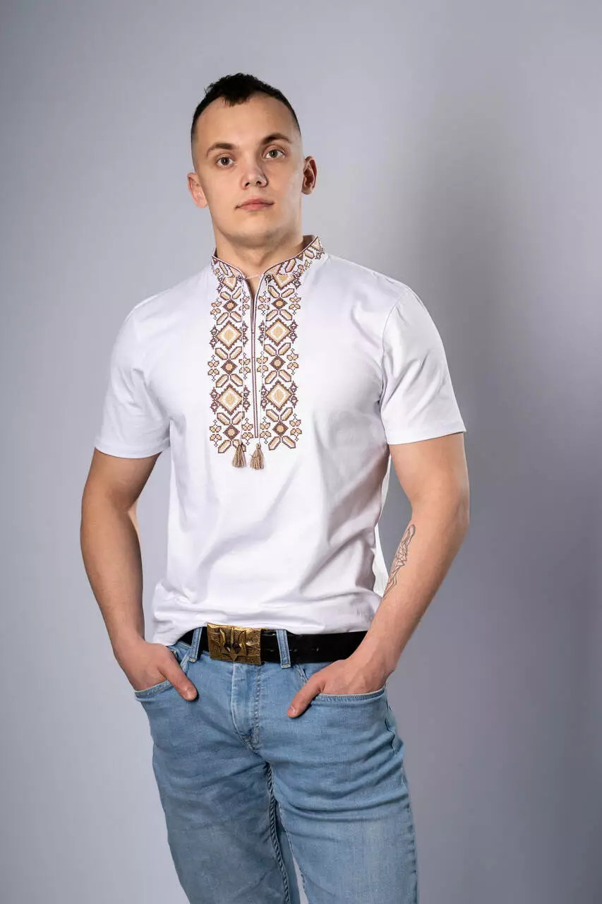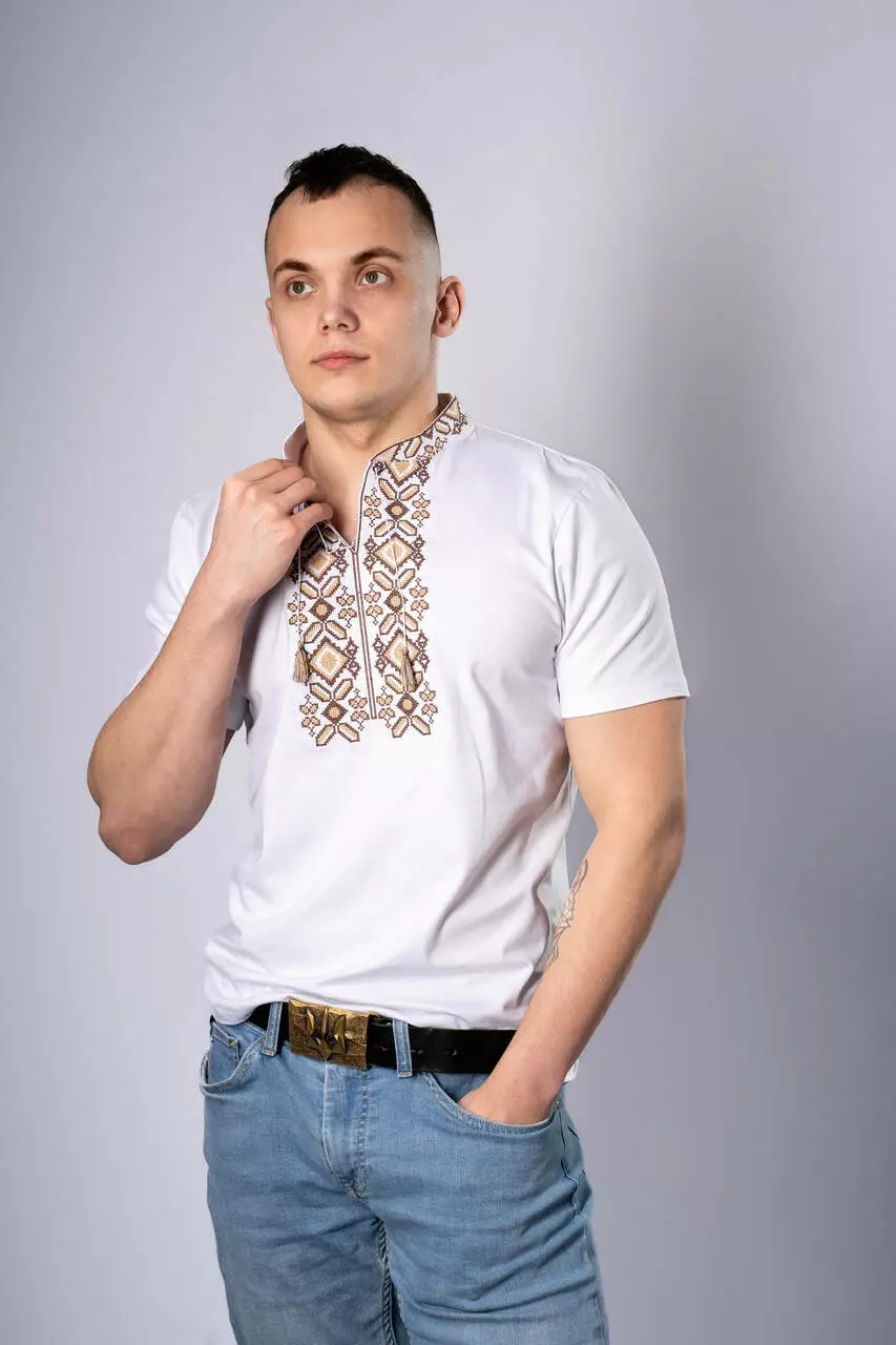 Стильна чоловіча вишита футболка на короткий рукав “Гетьман” це втілення чоловічої мудрості, патріотизму, свободи та козацтва.Футболка виконана на білій бавовняній тканині та прикрашена коричневою лаконічною вишивкою на грудях. Комфортний комірець стійка - підкреслює вишиту футболку. Футболка на дотик є дуже ніжною та комфортно прилягає до тіла, і найголовніше прекрасно зберігає свій вигляд навіть після багаторазового прання.