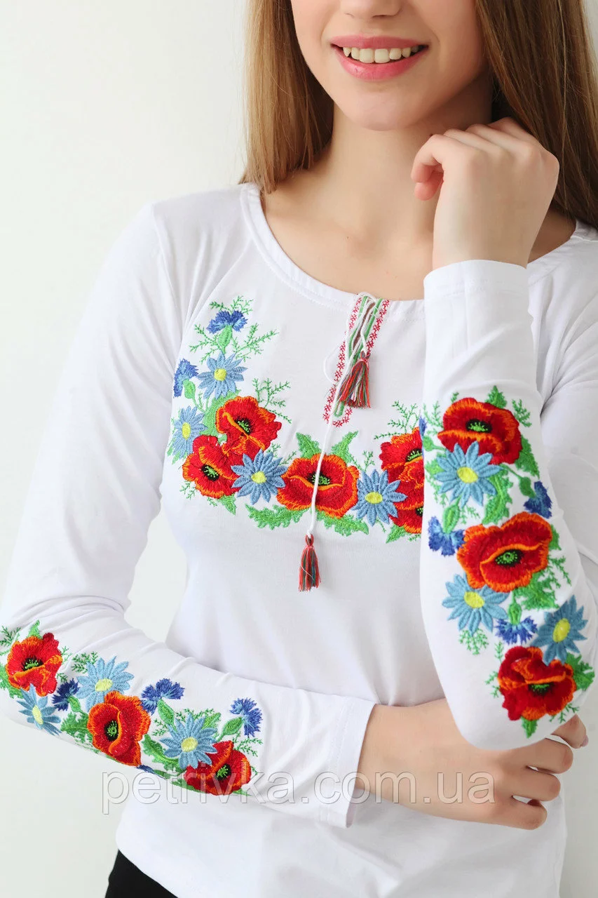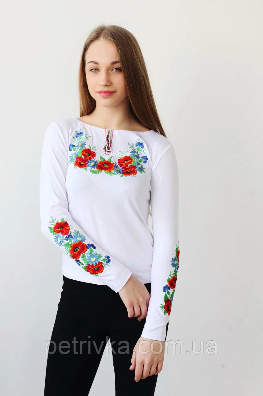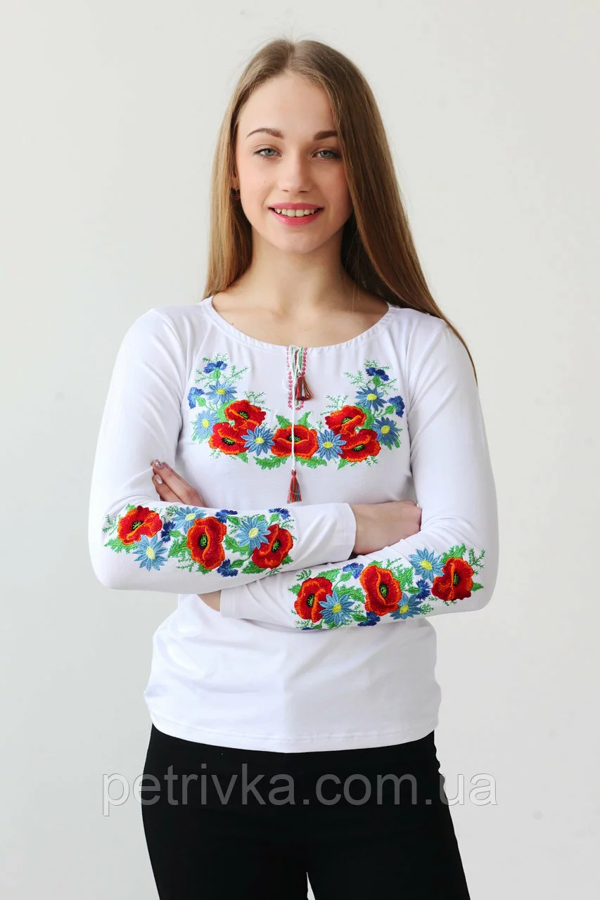 Неймовірна жіноча вишита футболка на довгий рукав, з вишивкою на рукавах маки В-7