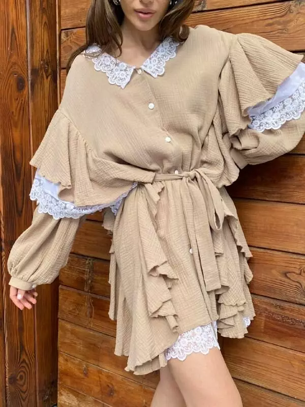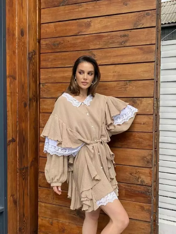 Бавовняна сукня з мереживом має вільний крій і тому має чудовий вигляд на будь-якій фігурі, має волани на рукавах і застібається на ґудзики  Повітряна сукня в стилі орнаментів прикрашена мереживами на комірі, рукавах та знизу виробу, пояс в тон йде у комплекті