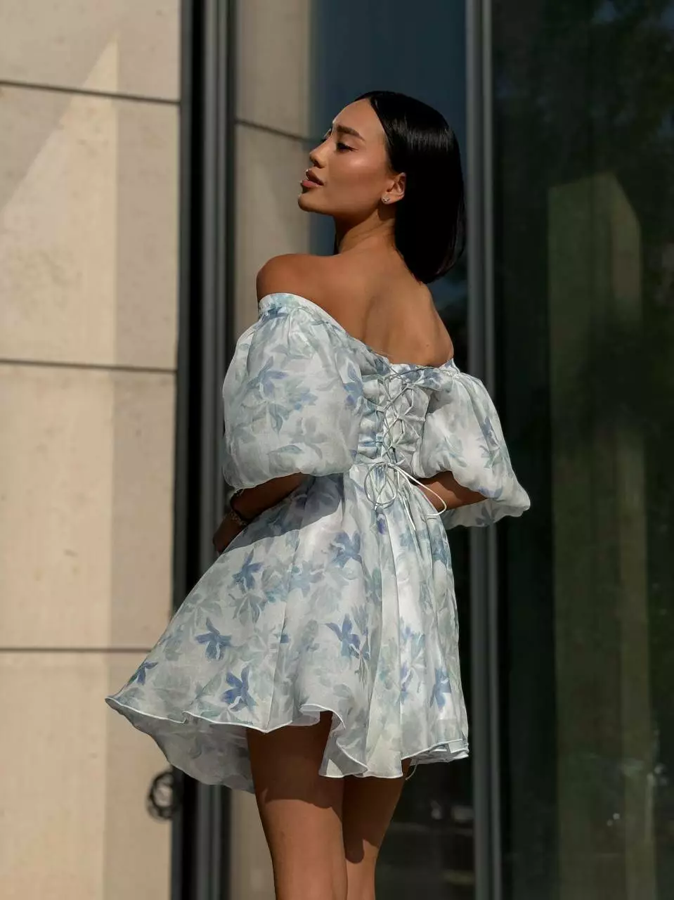 Тендітна корсетна сукня з мʼяким ліфом, обʼємними рукавами та пишною спідницею. Обʼєм сукні регулюється корсетною шнурівкою по спинці.