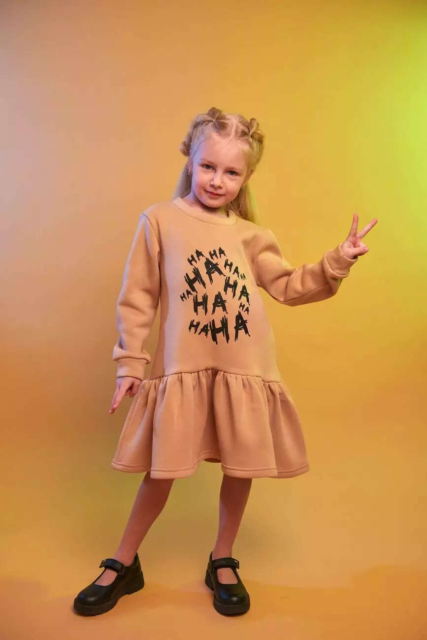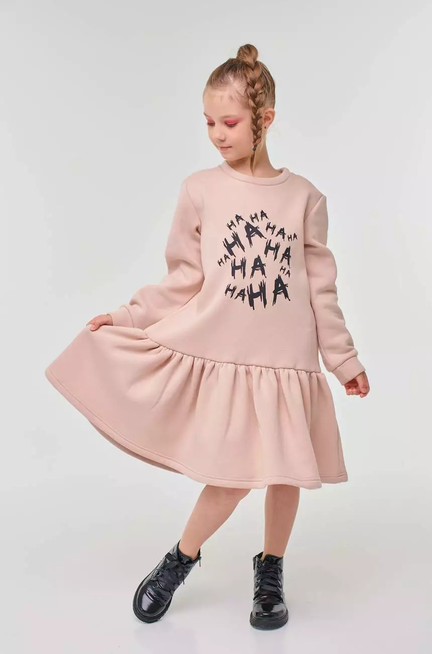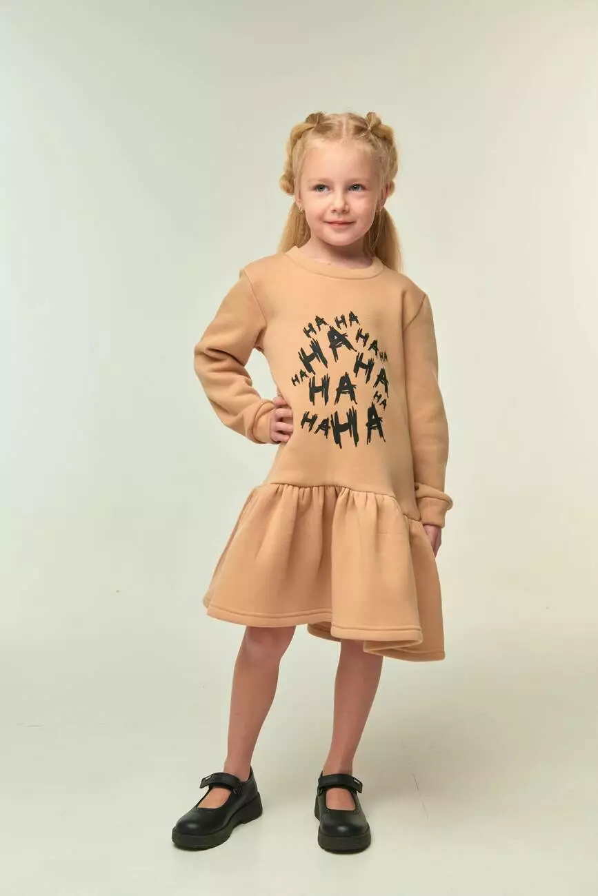 Тепла сукня для дівчинки. Практичний варіант на холодну пору. Розмірний ряд: на зріст від 110 см до 140 см. Деталі моделі: Колір сукні - бежевий. Вільний силует із заниженою лінією талії та зібраним рюшем по низу. Кругла горловина. Довгий рукав з манжетами. Занижена лінія плеча. На грудях чорний принт. Матеріал - трьохнитка з флісом.Склад: 90% бавовна, 10% еластанРекомендації по догляду: машинне прання при температурі 30 градусів. *Відтінок кольору на фотографії може відрізнятися від реального]]>