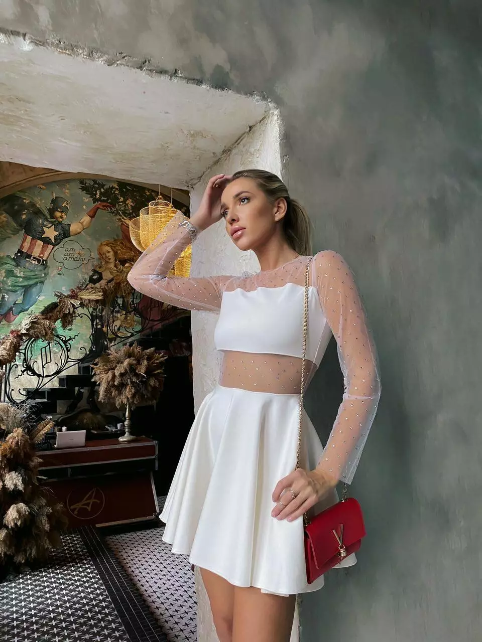 Арт 349 Сукня Cat Мила сукня зі спідницею-сонце із щільного трикотажу, вставки із сітки з камінням Тканина: Джерсі, сітка зі стразами Колір: молоко Розмір: S/L (42-46)