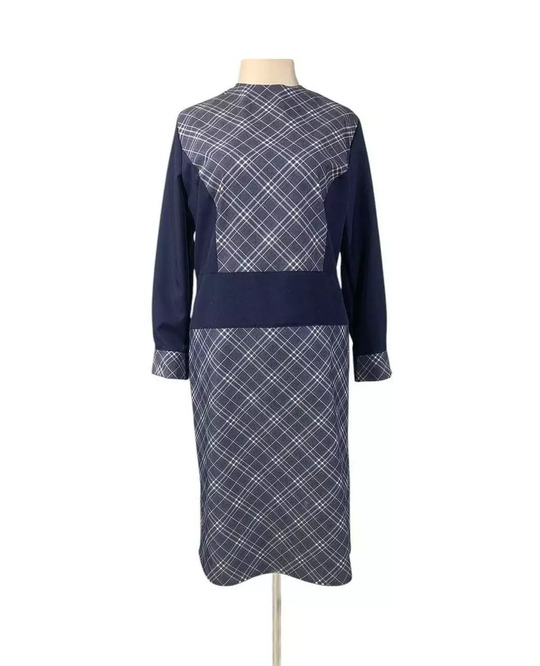 темно-синьому кольорі із вставками у клітину. Сукня має прямий