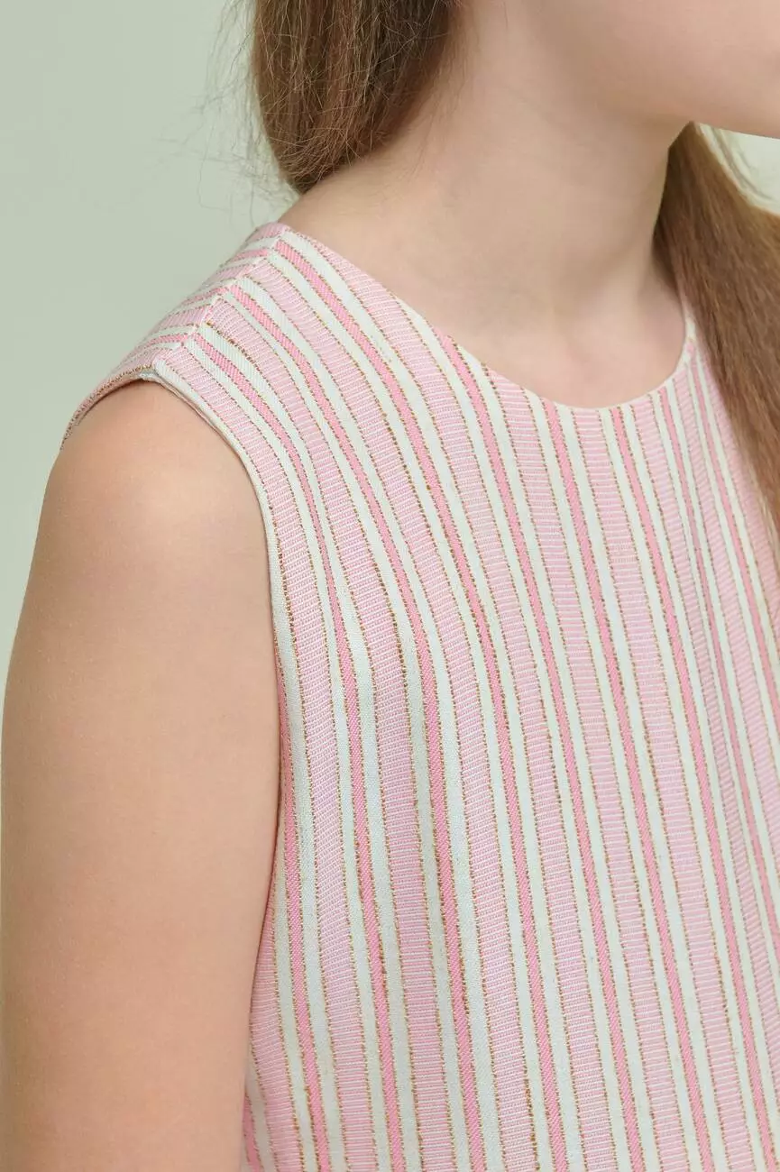 лаконічними смугами. Сукня без рукавів, кругла горловина.