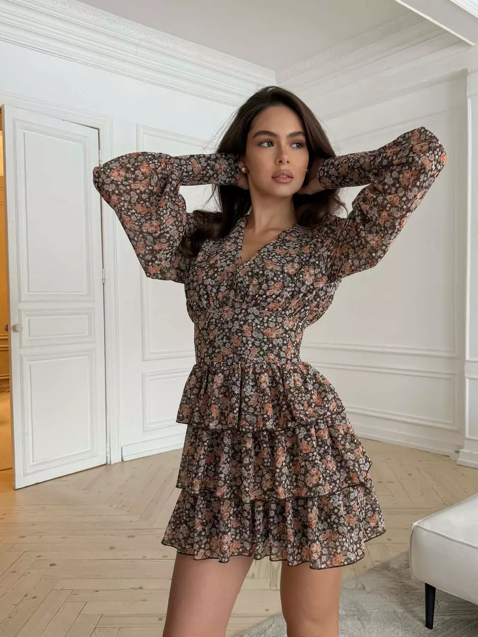 Тендітна повітряна сукня, з V -образним декольте. Талія має ефект утяжки талії, по спинці резинка. Широкі манжети рукавів декоровані ґудзиками обтягнутими в тканину. Спідниця 3 шарова та пишна.