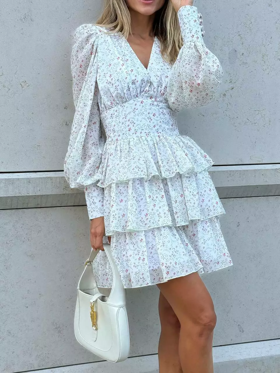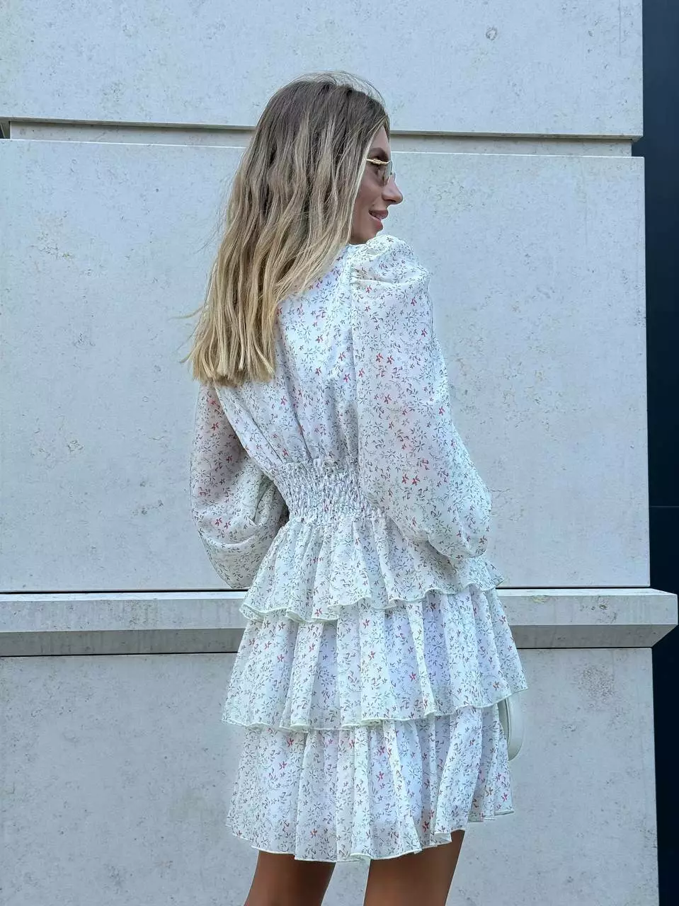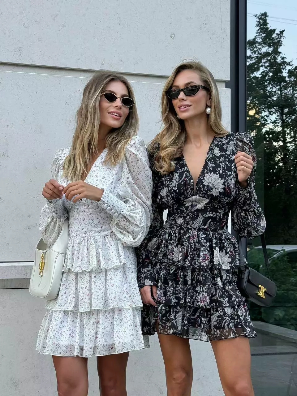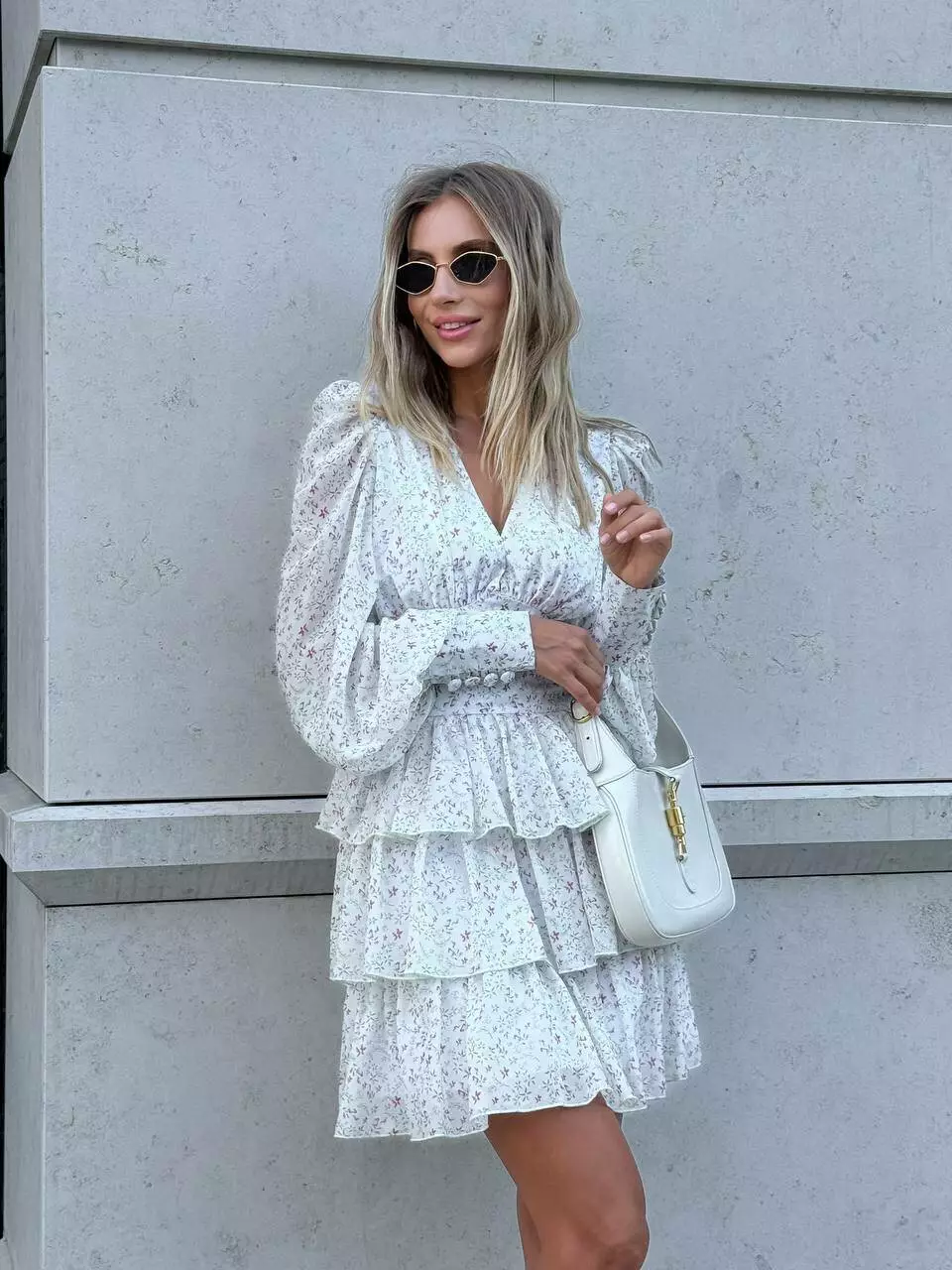 Тендітна повітряна сукня, з V -образним декольте. Талія має ефект утяжки талії, по спинці резинка. Широкі манжети рукавів декоровані ґудзиками обтягнутими в тканину. Спідниця 3 шарова та пишна.