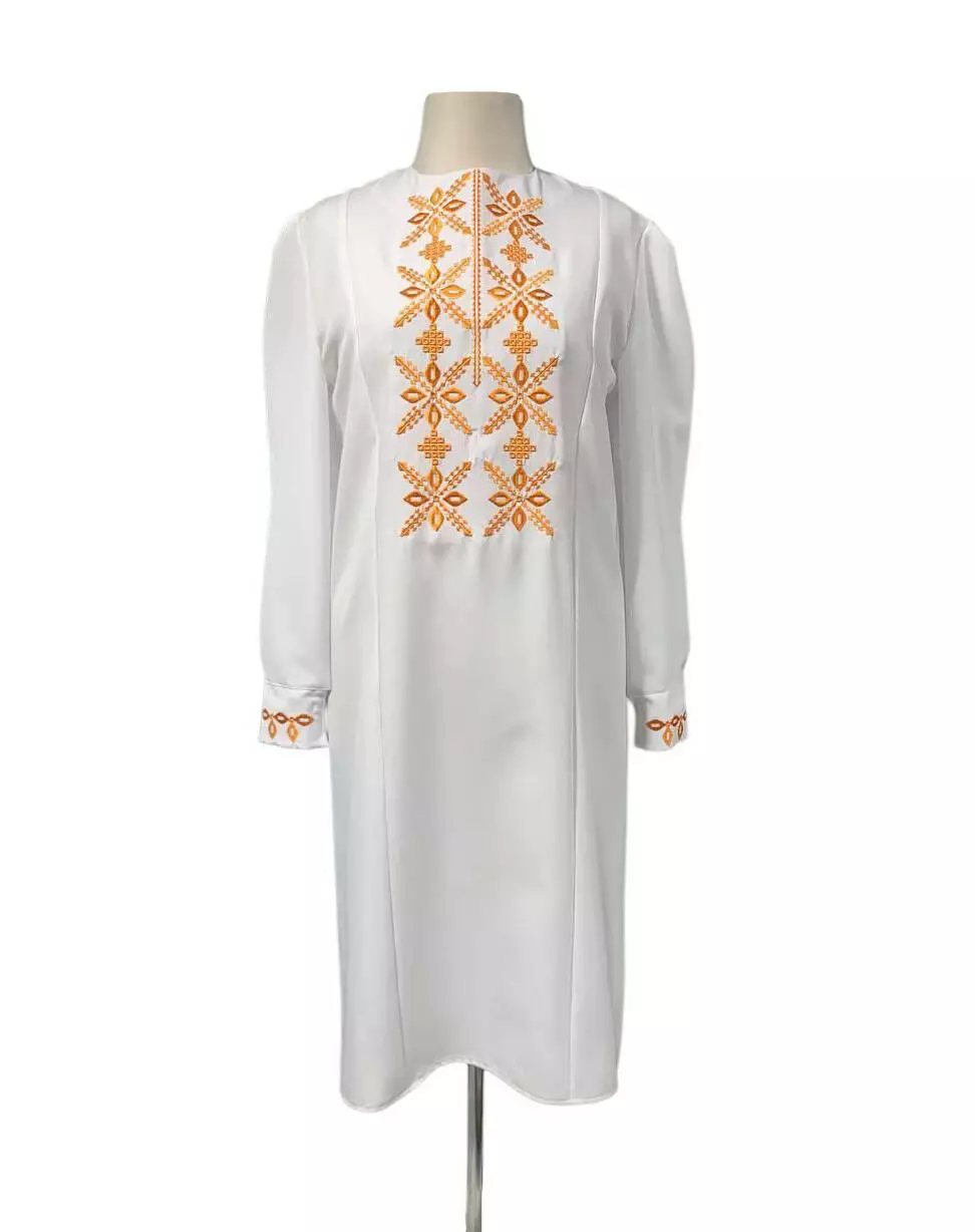 вишивкою. Сукня прямого силуету, довжиною нижче коліна, з довгими