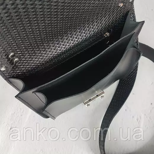 Сумочка закрывается на замок-защелку, имеет два отделения и потайной внутренний карман. Имеется короткая ручка и широкий плечевой ремень на карабинах с регулировкой длины.