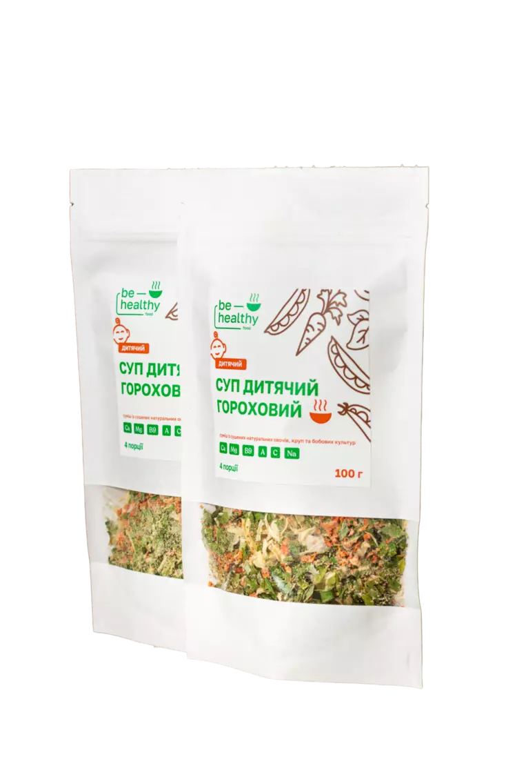 Суп дитячий "Гороховий" від ТМ BE HEALTHY FOOD - смачний та поживний супчик, яка точно сподобається малюкові. Висока концентрація кальцію, а значить, зміцнення кісток і зубів, поліпшення травної функції, нормалізація процесу кровотворення, сприятливий вплив на роботу серцевого м’яза, поліпшення розумової активності, що виражається в розвитку пам’яті та концентрації уваги - все це корисні властивості, які отримують наші діти при вживанні гороху. А корінь селери наситить дитину вітамінами, які зміцнять імунітет організму. При цьому батькам не доведеться витрачати багато часу та сил на приготування першої страви. Все, що вам потрібно для приготування - засипати суміш в киплячий бульйон/воду та зварити за вказаним часом.