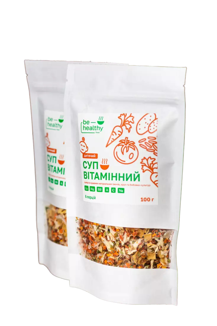 Суп дитячий "Вітамінний" від ТМ BE HEALTHY FOOD - це вітамінна скарбничка для дітей. Маленькі гурмани оцінять його ніжний смак та приємний аромат. Все, що вам потрібно для приготування - засипати суміш в киплячий бульйон/воду та зварити за вказаним часом.
