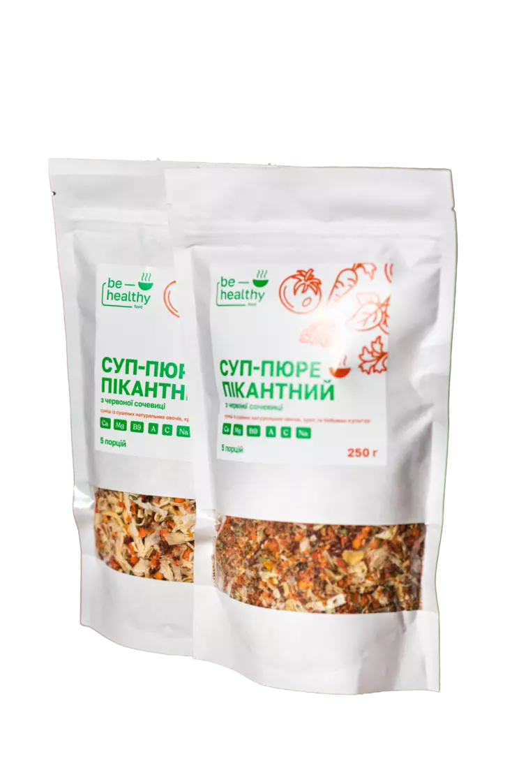 Суп-пюре "Пікантний" від ТМ BE HEALTHY FOOD - це поєднання якісної корисної червоної сочевиці, сушених овочів та трав, які підкорюють наші смакові рецепорі з першої ложки. Все, що вам потрібно для приготування - засипати суміш в киплячий бульйон/воду та зварити за вказаним часом.