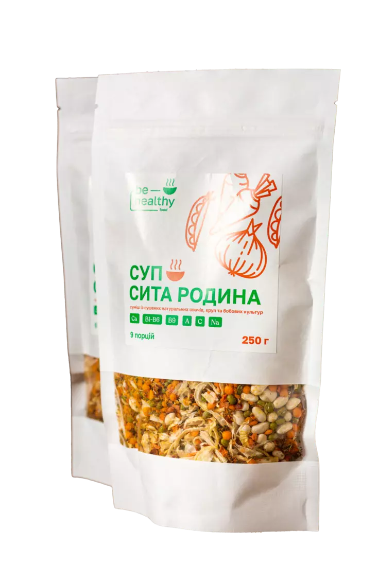 Суп "Сита родина" від ТМ BE HEALTHY FOOD - це смачний та дуже поживний суп, адже в його складі ви знайдете розмаїття бобових культр в доповненні з сушеними овочами та спеціями, які наситять ваш організм. Будьте впевнені, що вся родина протягом довготривалого часу буде ситою!Для приготування вам необхідно всього лиш засипати суміш в киплячу воду або бульйон та зварити його за вказаним часом.