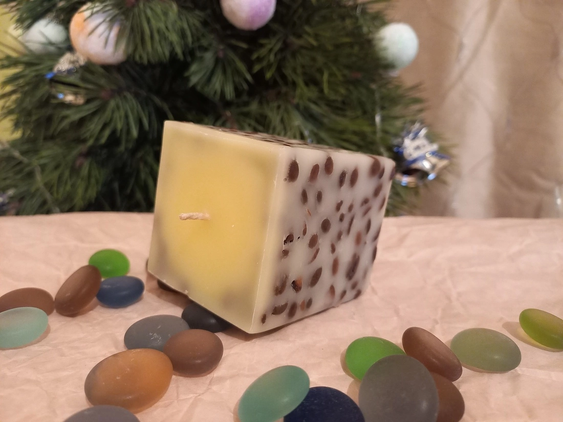 Свічка з зернами кави і неперевершеним кавовим ароматом. Розміри 7×7×6 см. Колір може бути різним.