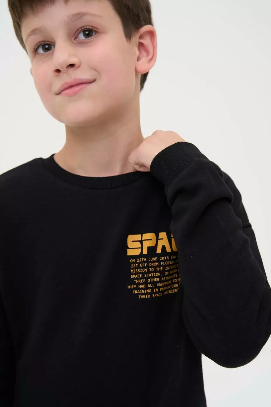 Зустрічайте нову колекцію - колаборація брендів YUMSTER і NEWNESS! Деталі моделі: світшот чорного кольору. Кругла горловина, довгий рукав. Попереду помаранчевий принт у вигляді тексту. На спині принт білого кольору у вигляді графічного малюнка. Горловина, манжети на рукавах та низ світшота обрамлені еластичною резинкою. Розмірний ряд: на зріст від 128 см до 164 см