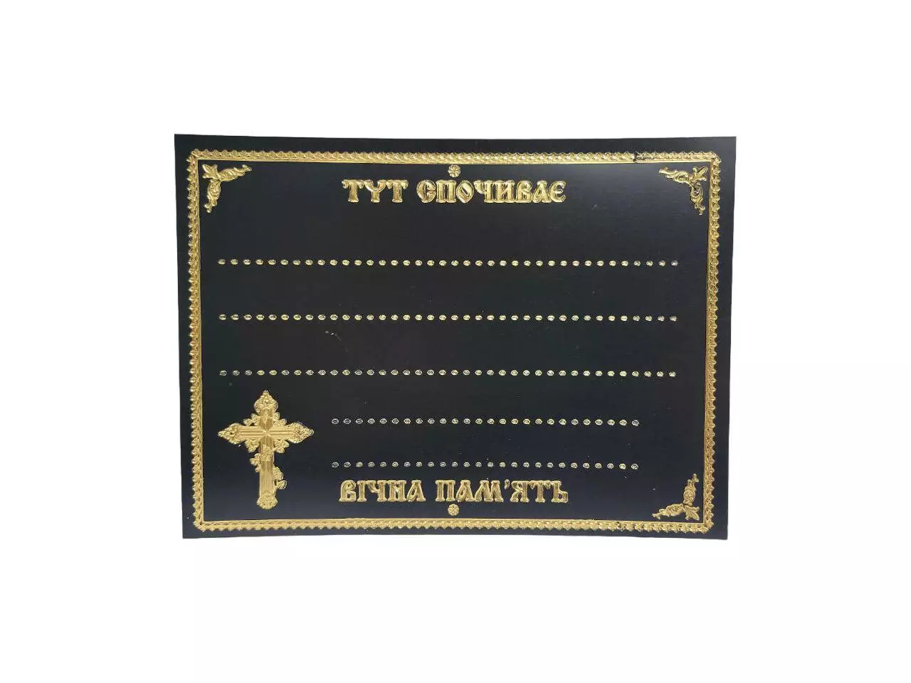 Табличка на хрест, по краю візерунок, розмір: 17*24 см. Виконана із