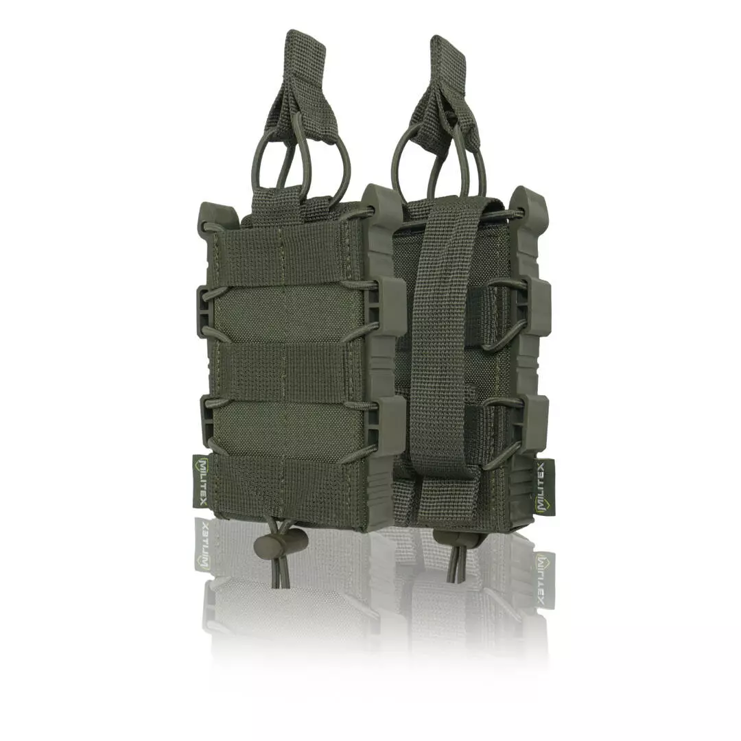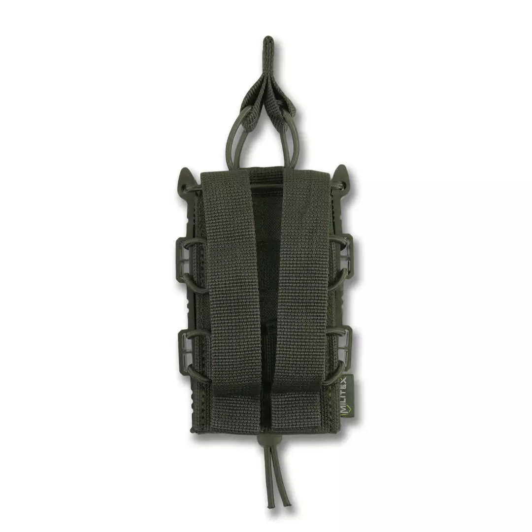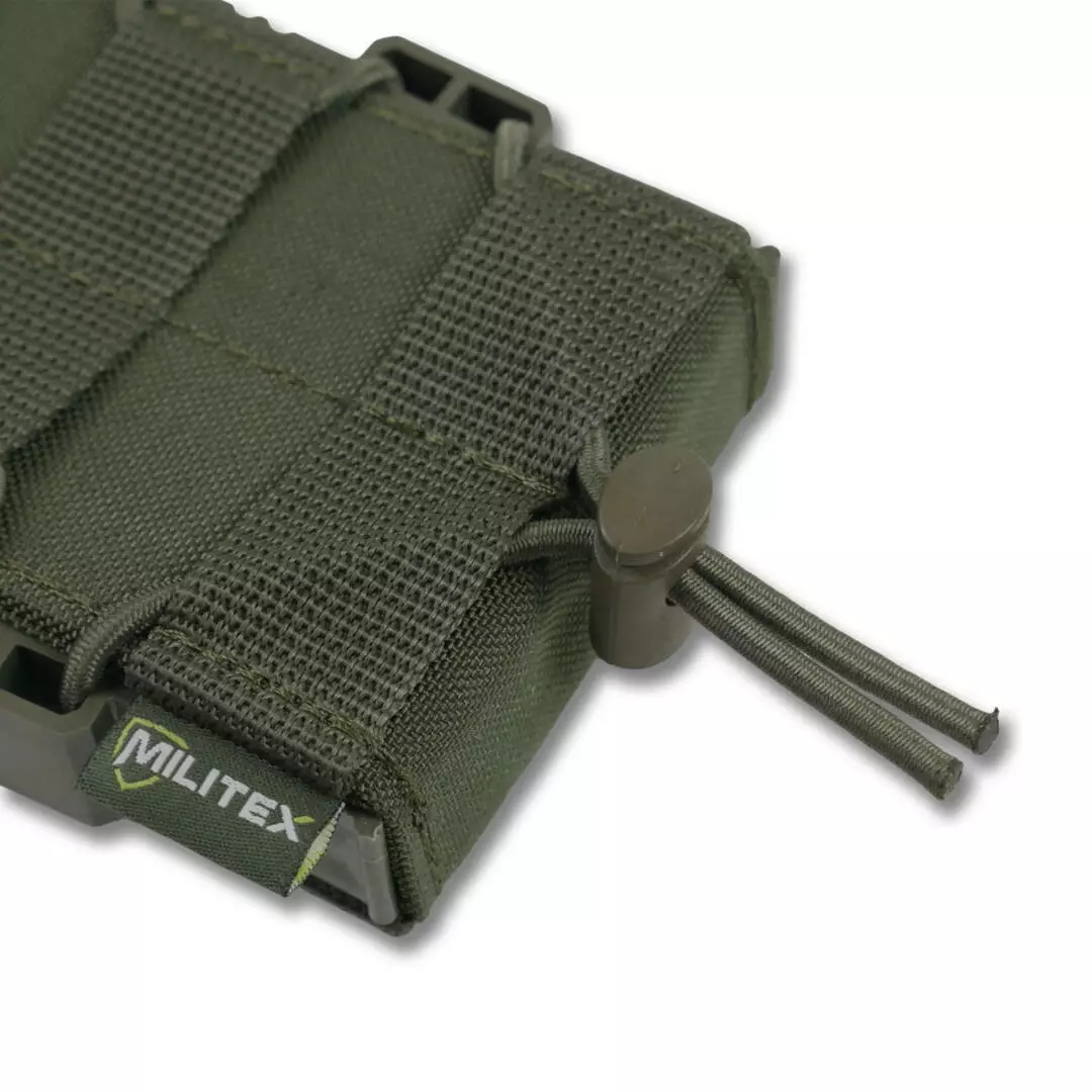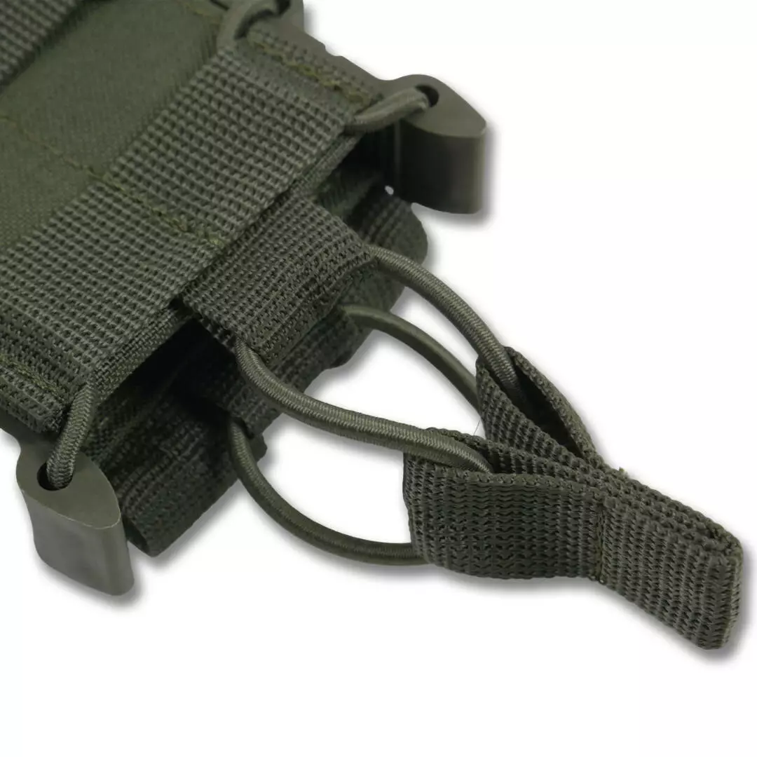 Сила сжатия магазина регулируется шнурком с качественным фиксатором, которым стянут подсумок. Сверху есть дополнительный фиксатор на резинке, который при необходимости можно снять.
