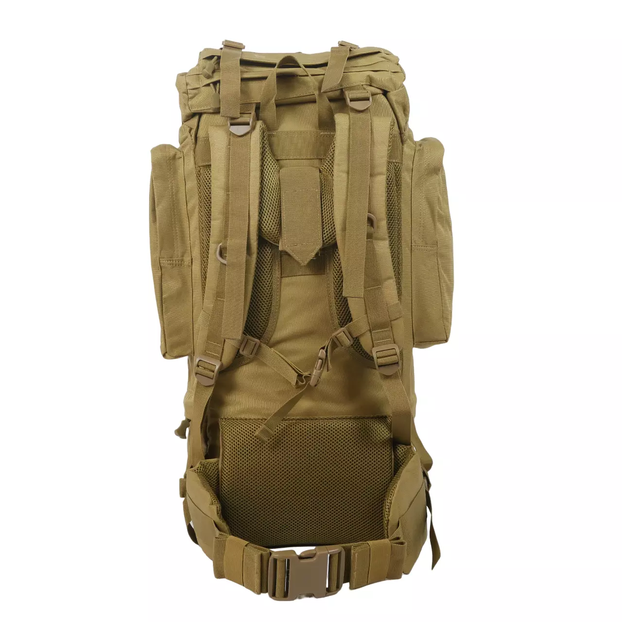 Изготовлен из крепкой ткани Oksford 600D. Рюкзак имеет большой основной отсек, две накладные карманы спереди и 4 кармана по бокам. Карманы влагостойкие, закрываются на застежки типа молния. Плечевые подтяжки регулируемые. Имеет алюминиевый каркас с мягкой спинкой. На бретельках нагрудный ремень на защелке фастекс для лучшего распределения веса. Для большего комфорта и оптимального распределения веса также есть широкий поясной ремень. Рюкзак оборудован системой строп Molle для дополнительного размещения на нем экипировки и оборудования. Эта модель разработана для использования военными и отлично подходит при продолжительных рейдах.