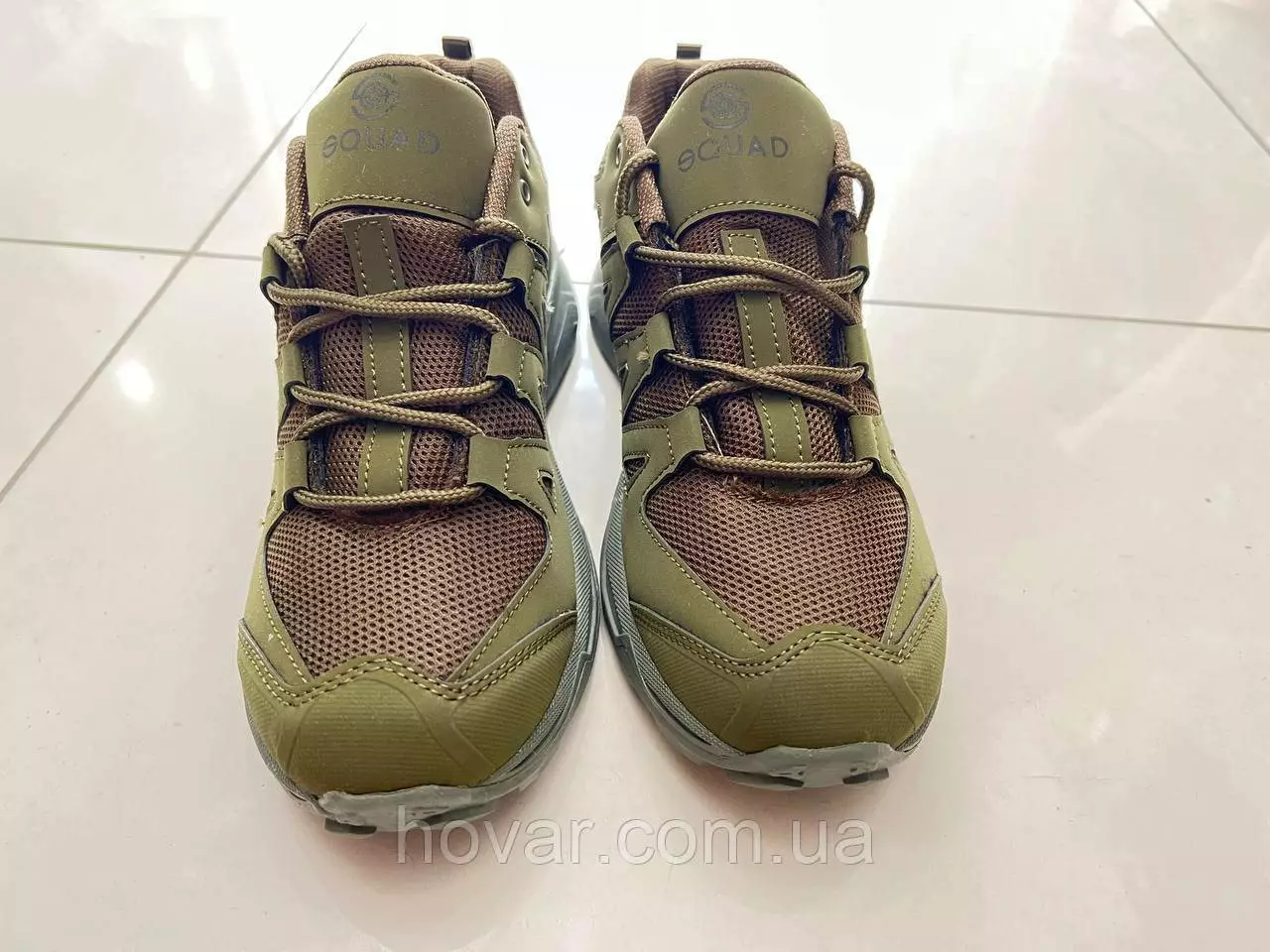 Літні тактичні кросівки SQUAD у кольорі олива підійдуть для використання як військове, армійське, спортивне, трекінгове або щоденне взуття в стилі мілітарі.  Виготовлені з міцного синтетичного матеріалу. Сіточка по всій поверхні взуття, завдяки чому можна зберігається природна терморегуляція ніг навіть у найспекотніші дні. Дуже зручні та легкі.
